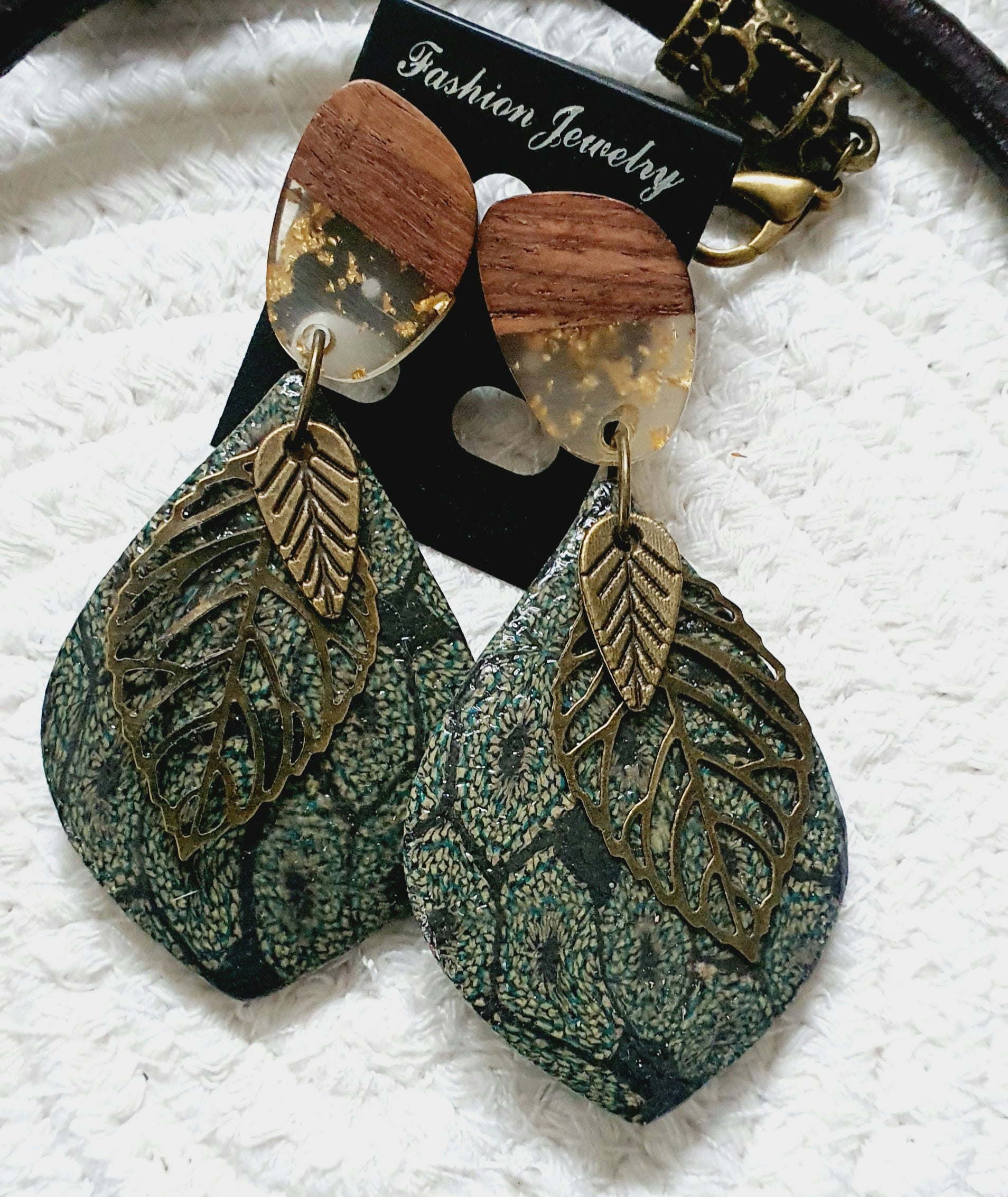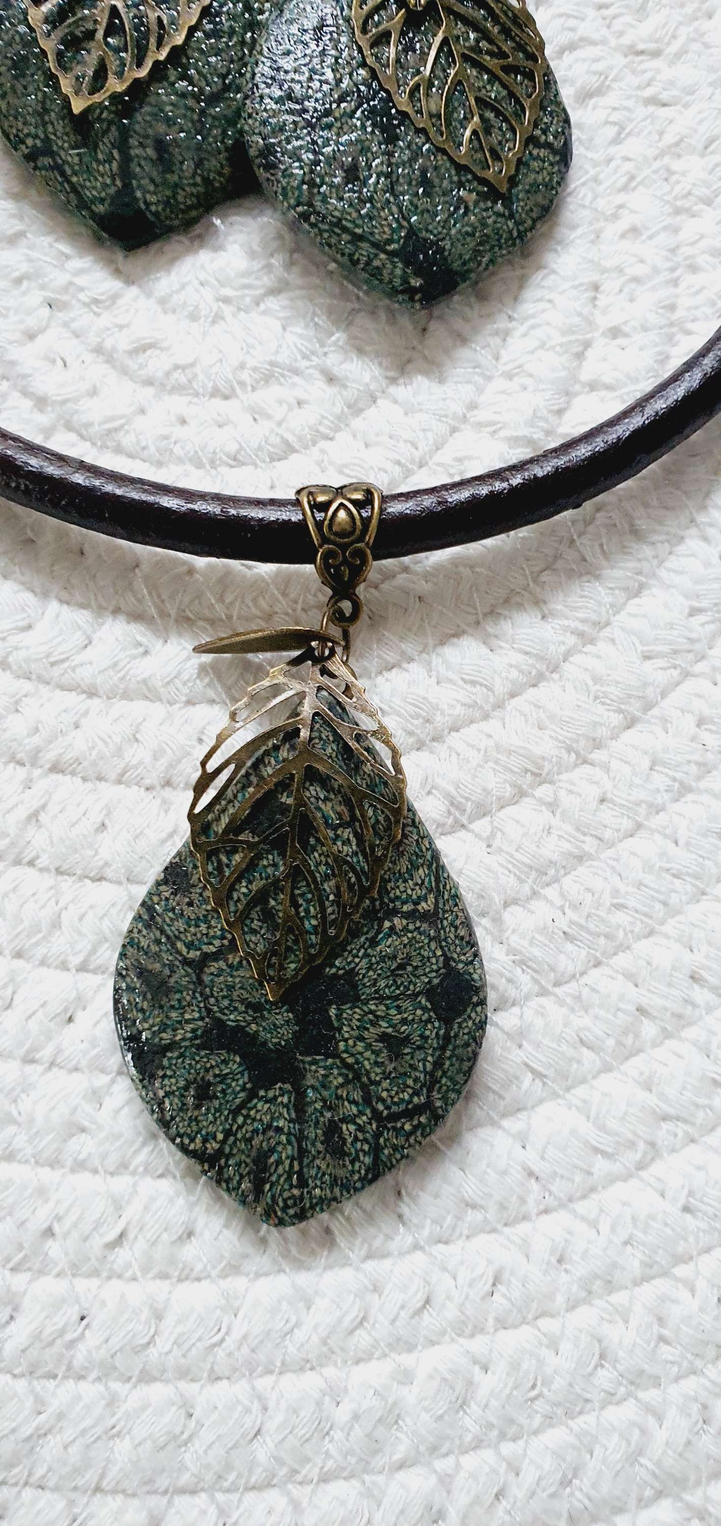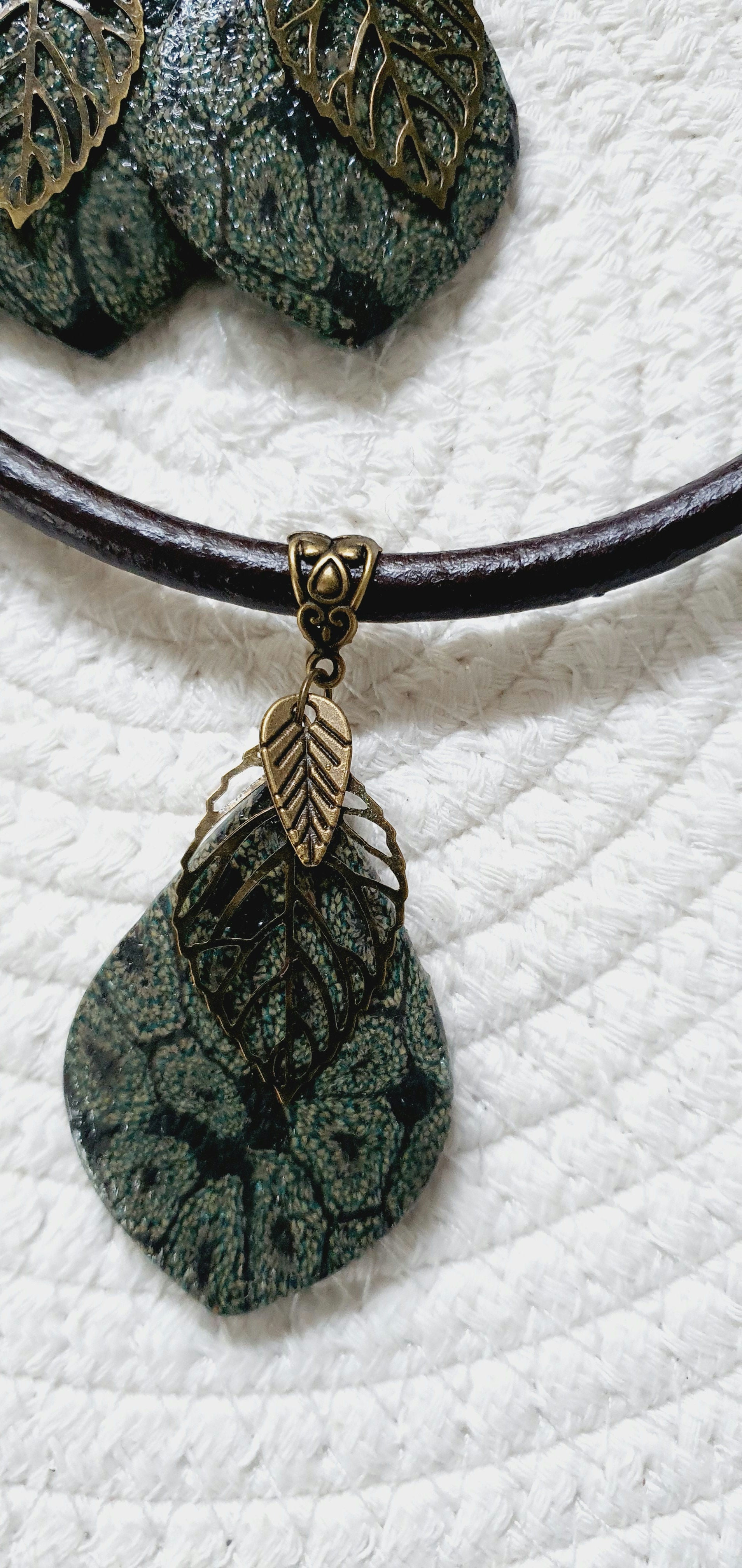 Cette parure "Feuilles" est idéal pour un look naturel et élégant. Le pendentif et les boucles d'oreilles avec breloques en feuilles sont montés sur un collier en cuir marron assorti pour un style cohérent. Le montage sur un apprêt en bois et résine ajoute une touche unique à cette parure.