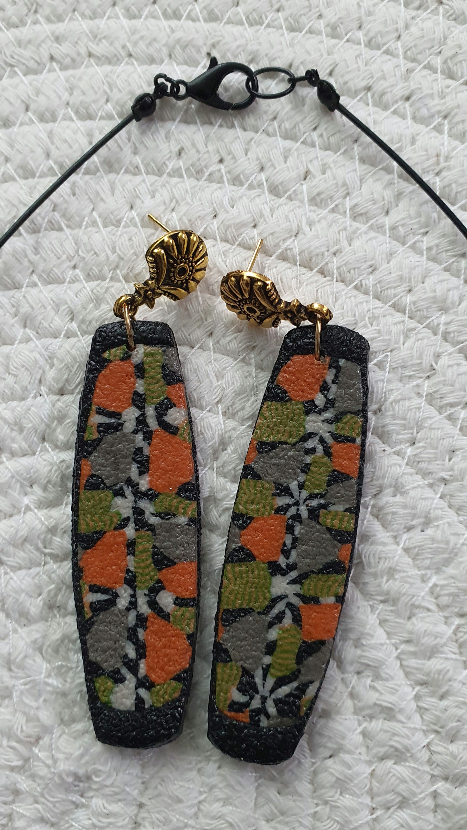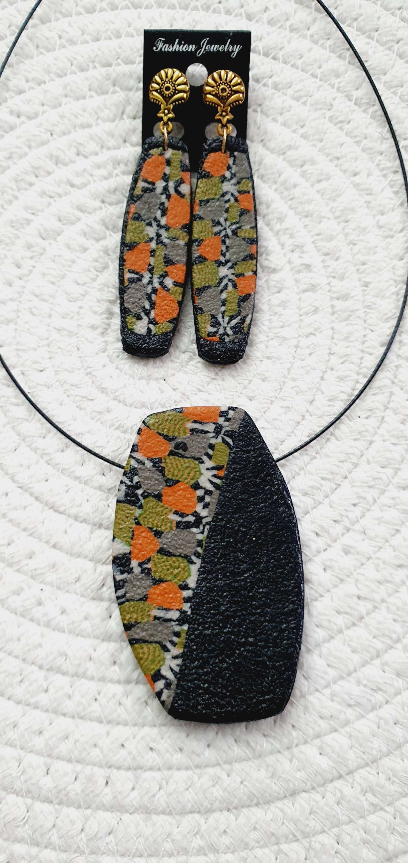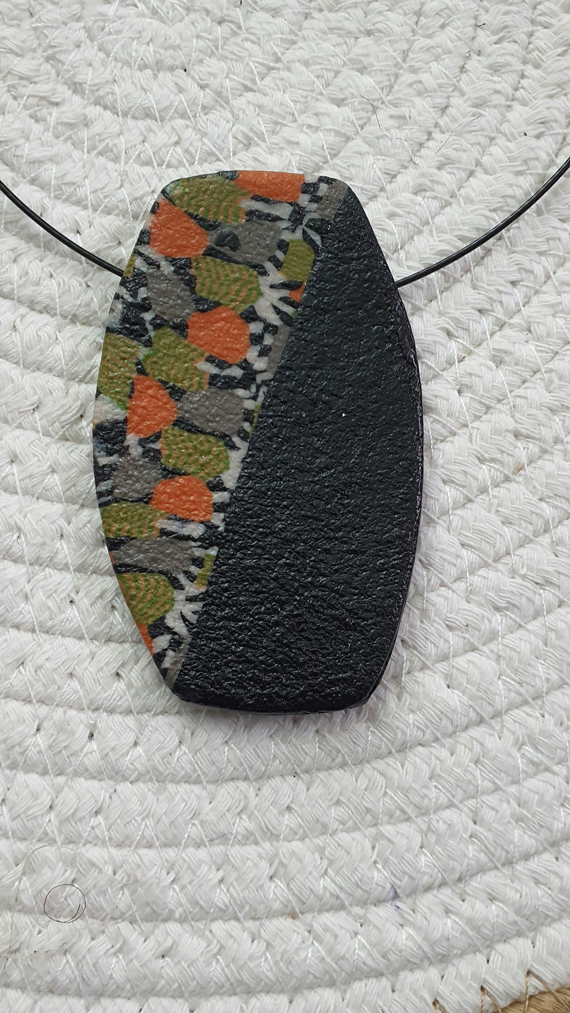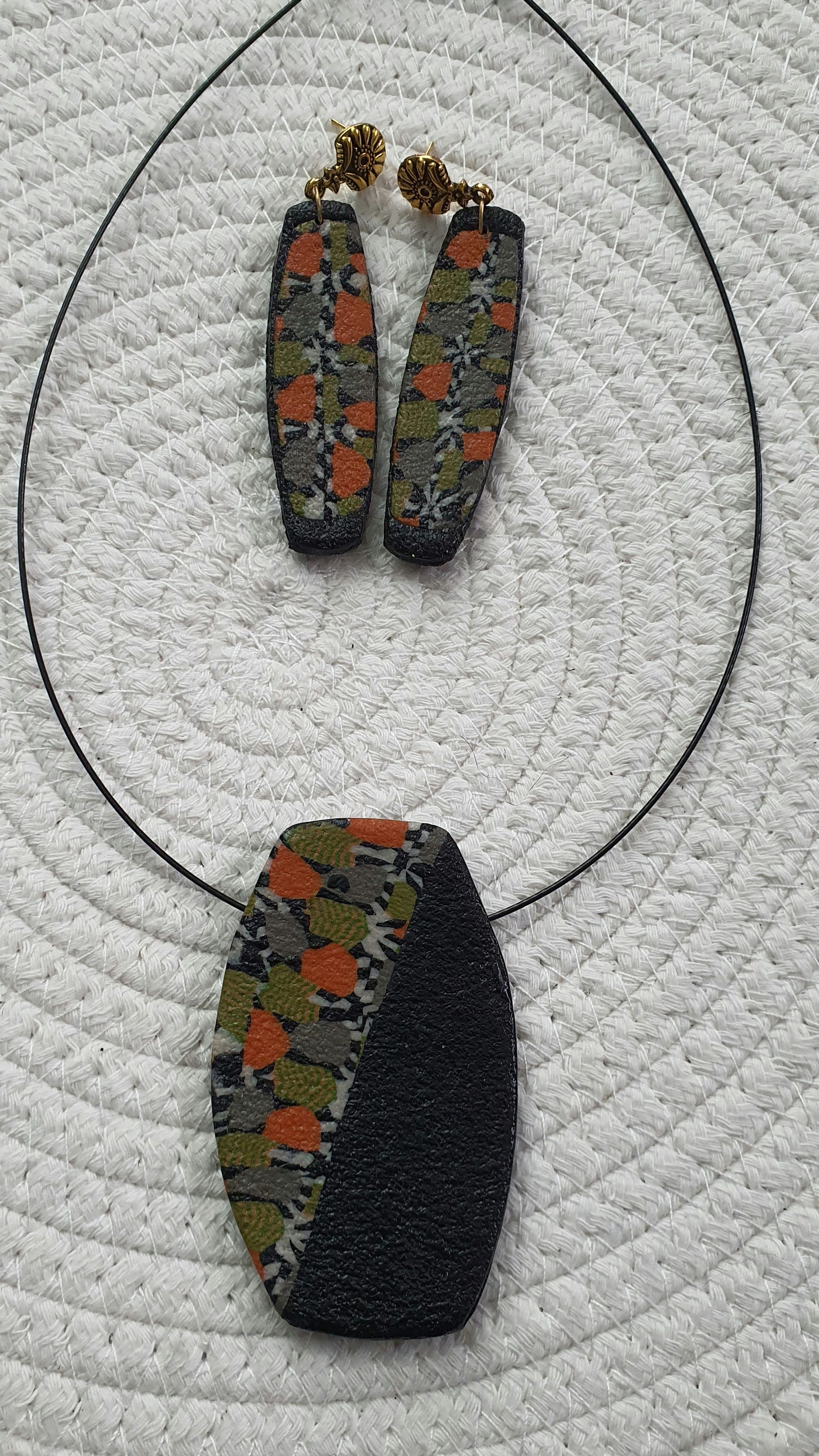 Cette magnifique parure comprend un collier en pâte polymère, mesurant 45 mm de largeur et 75 mm de hauteur, suspendu à un cable en acier inoxydable de couleur noir et un fermoir homard noir.