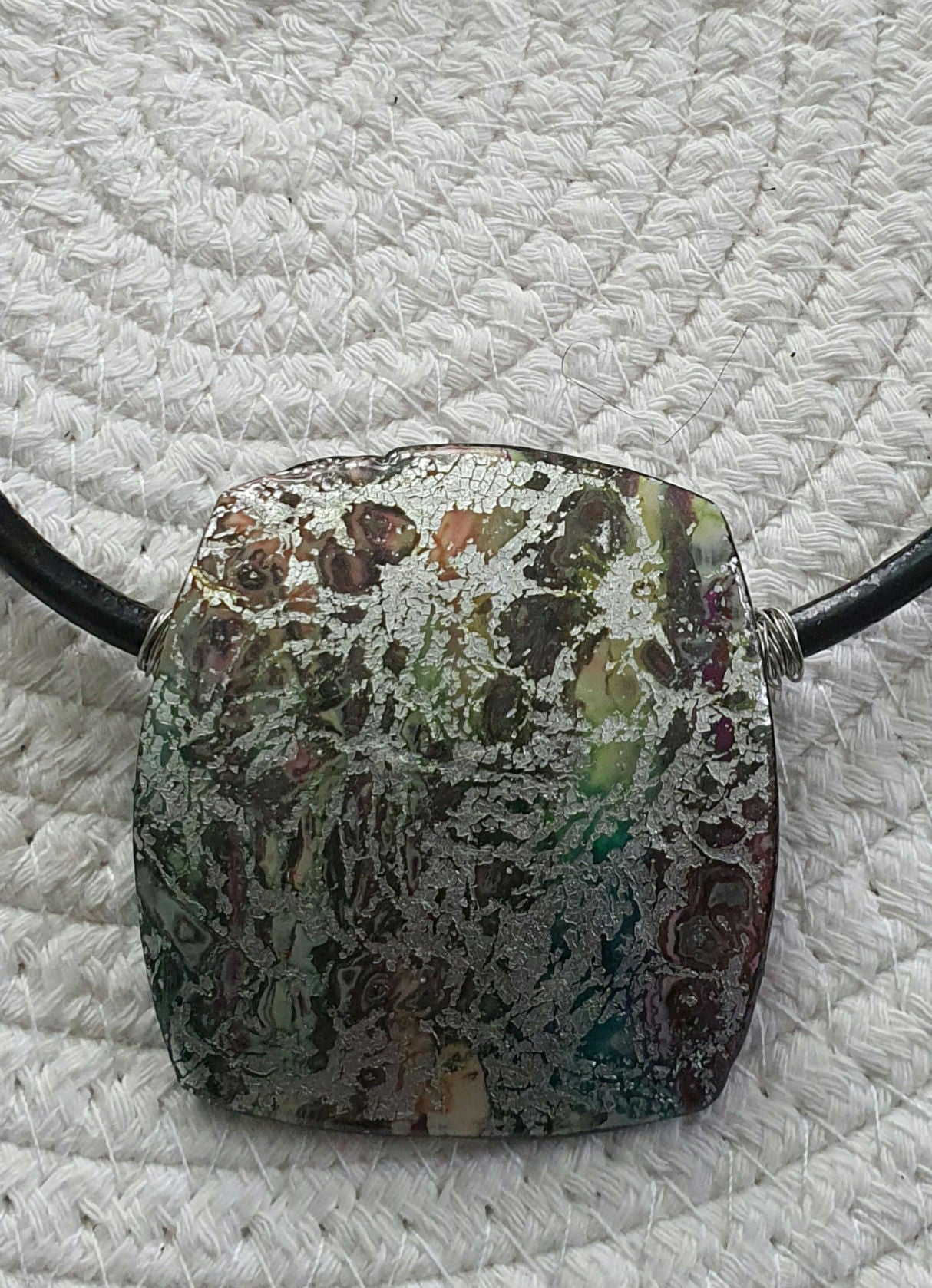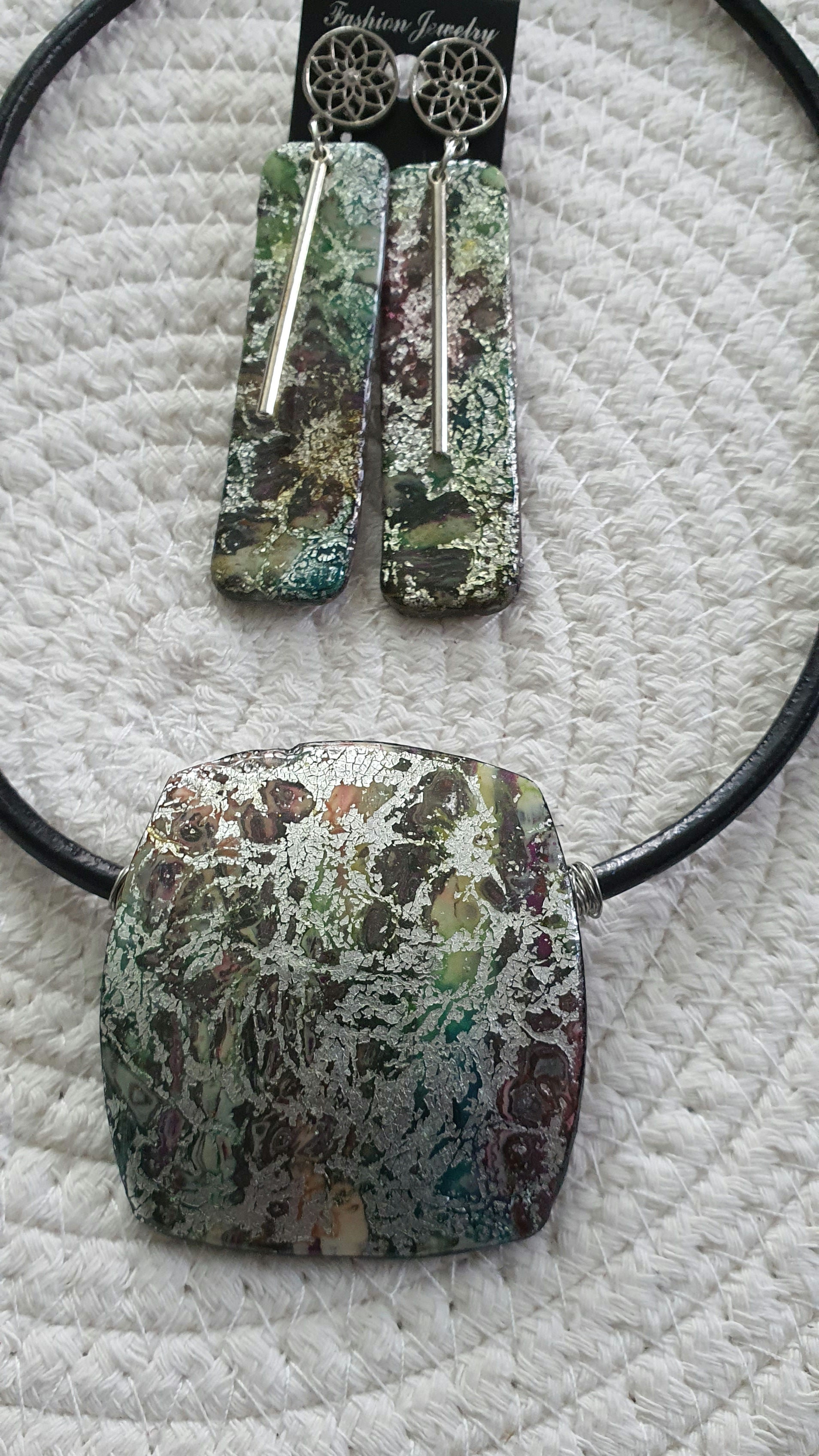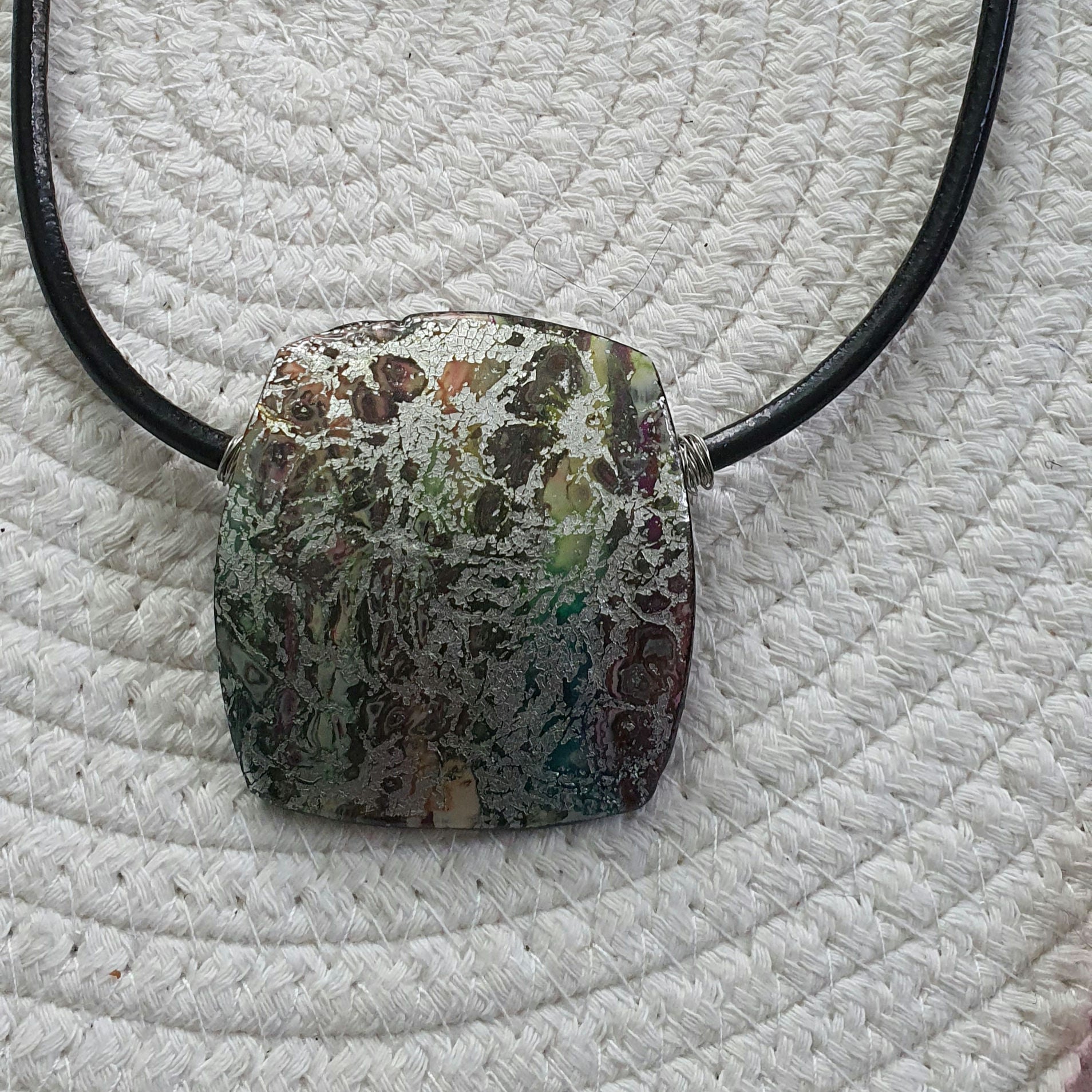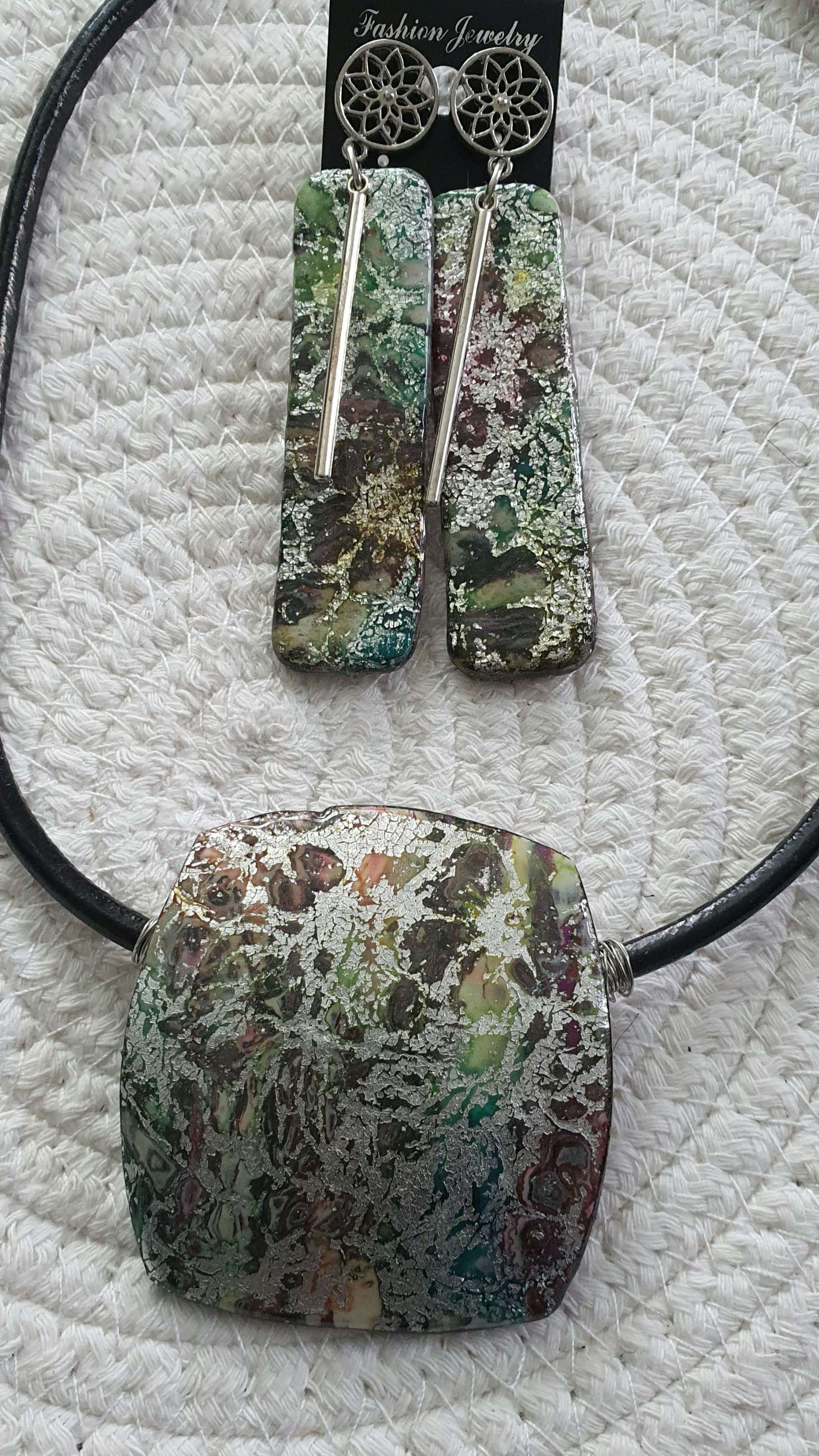Osez l'aventure avec la parure "Glacial" ! Composée d'un collier ras de cou en cuir marron orné d'un pendentif argenté et coloré de 52mm x 57mm, ainsi que de boucles d'oreilles rectangulaires de 80mm de long, cette magnifique parure apportera une touche audacieuse à votre tenue.