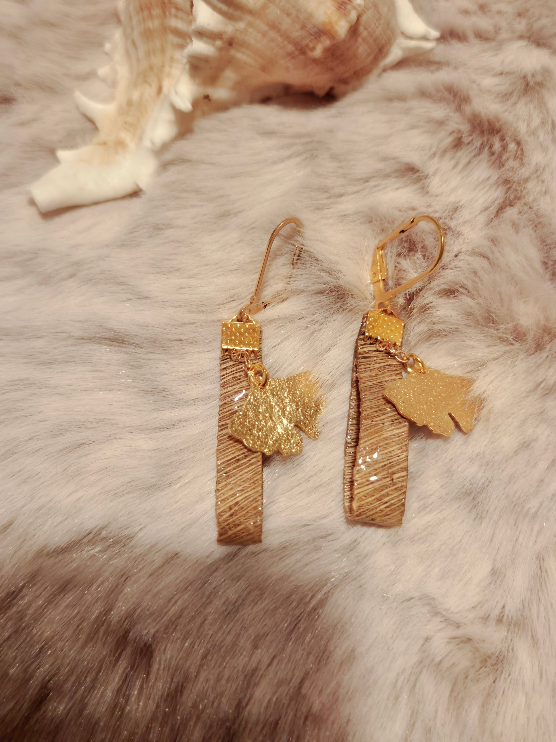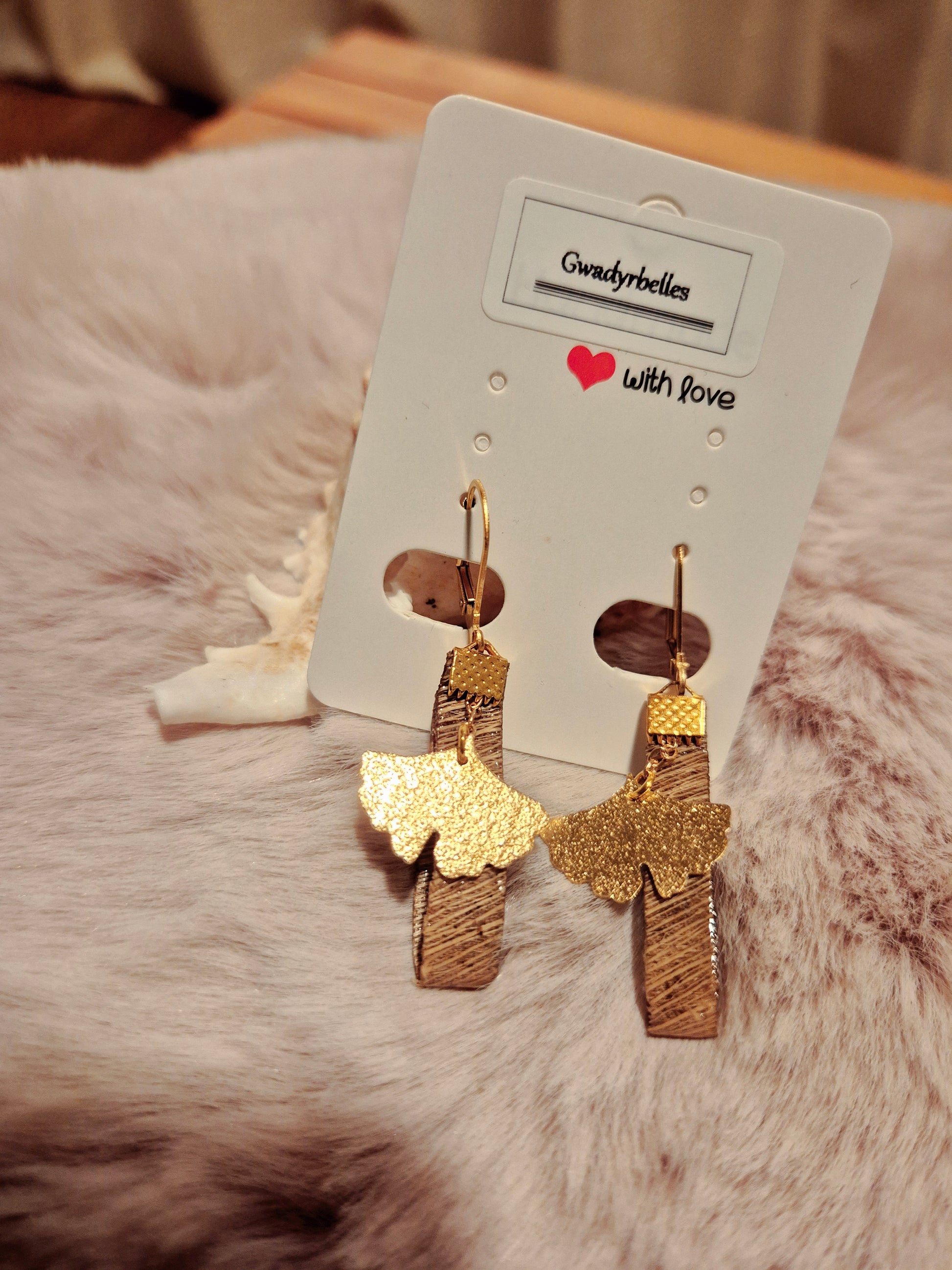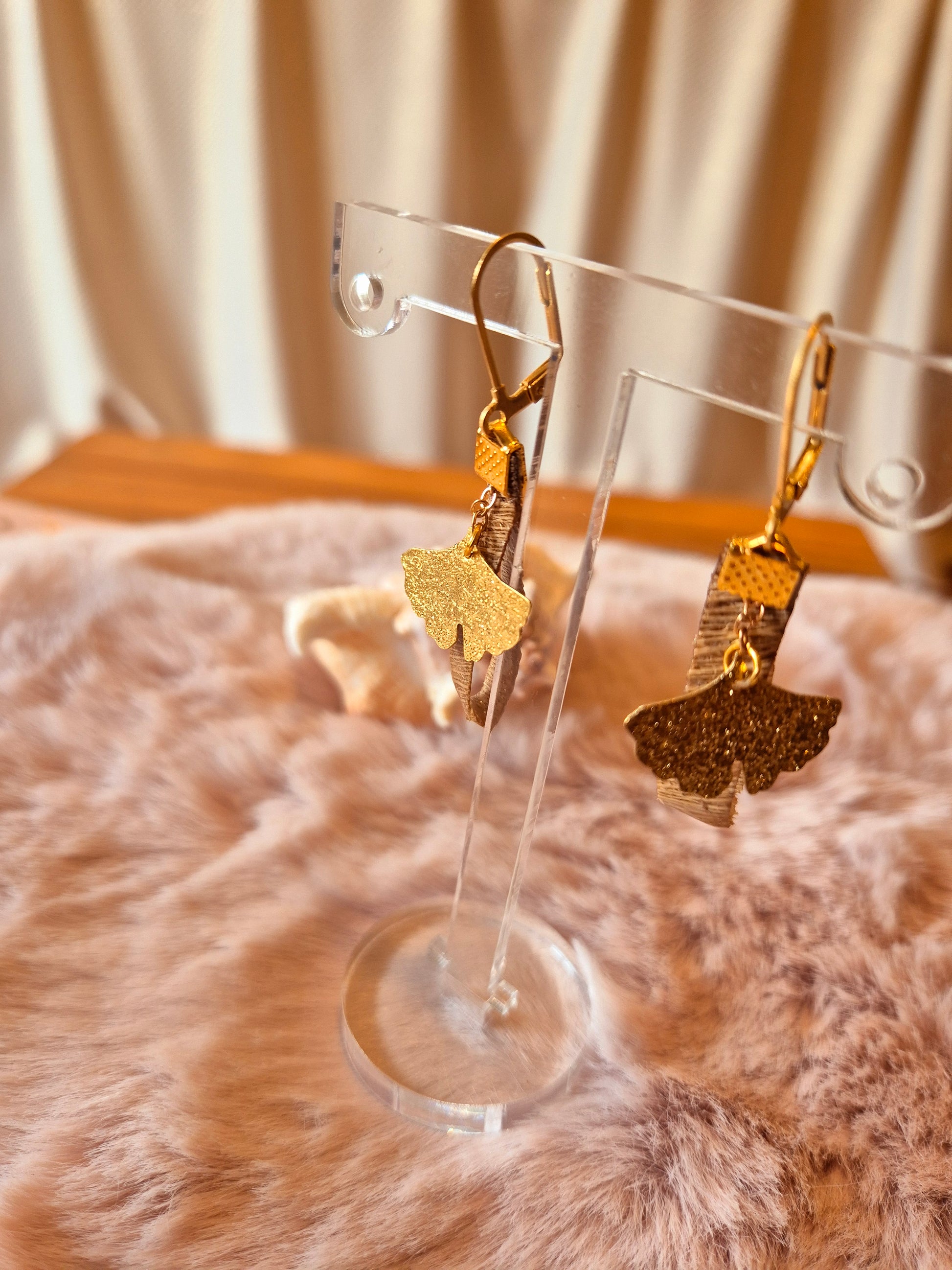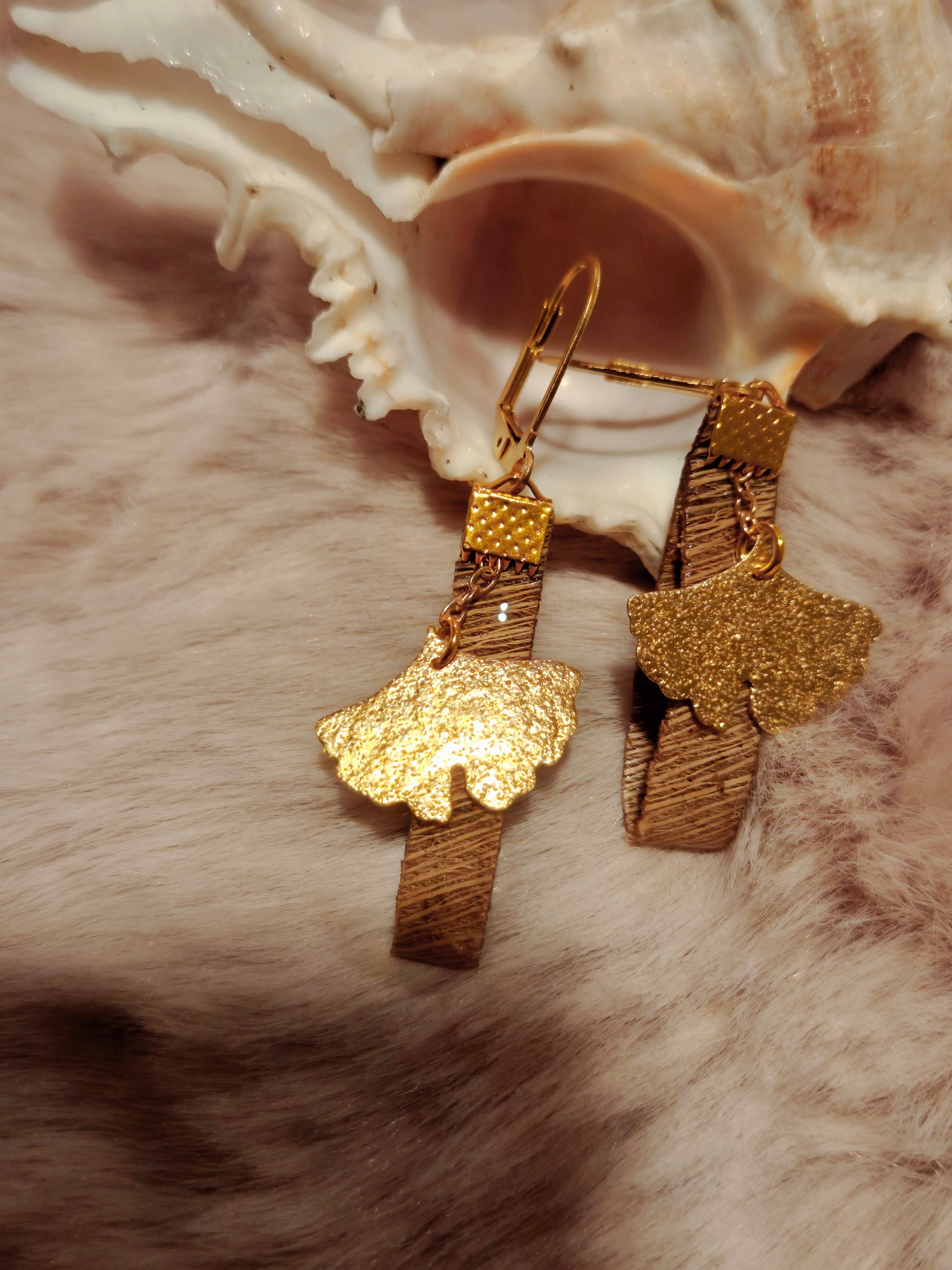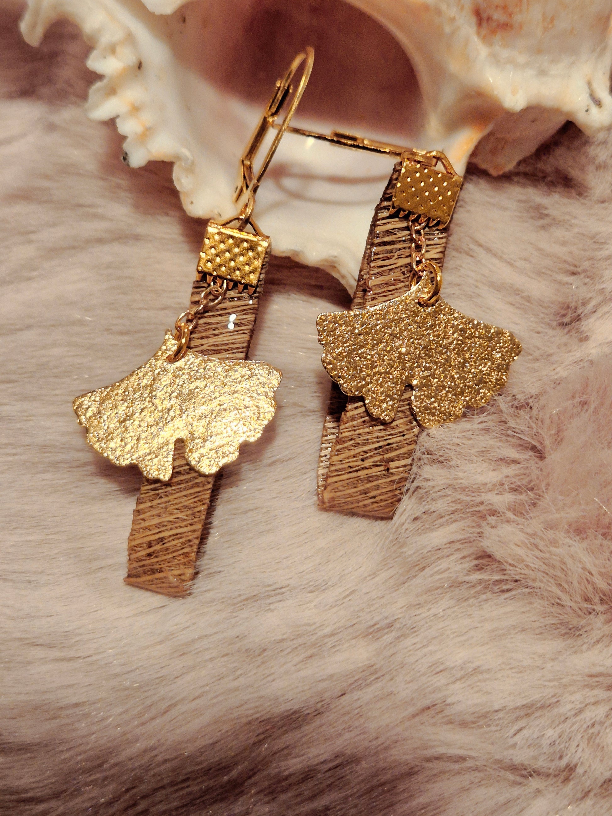 Adoptez nos splendides boucles d'oreilles en fibres de cocotiers . L'apprêt en acier inoxydable doré et la breloque motif feuille de ginkgo ajoutent une touche exclusive à votre look. Une longueur totale de 50mm et la largeur de 8mm , ainsi que sa légèreté vous permet de briller avec style.