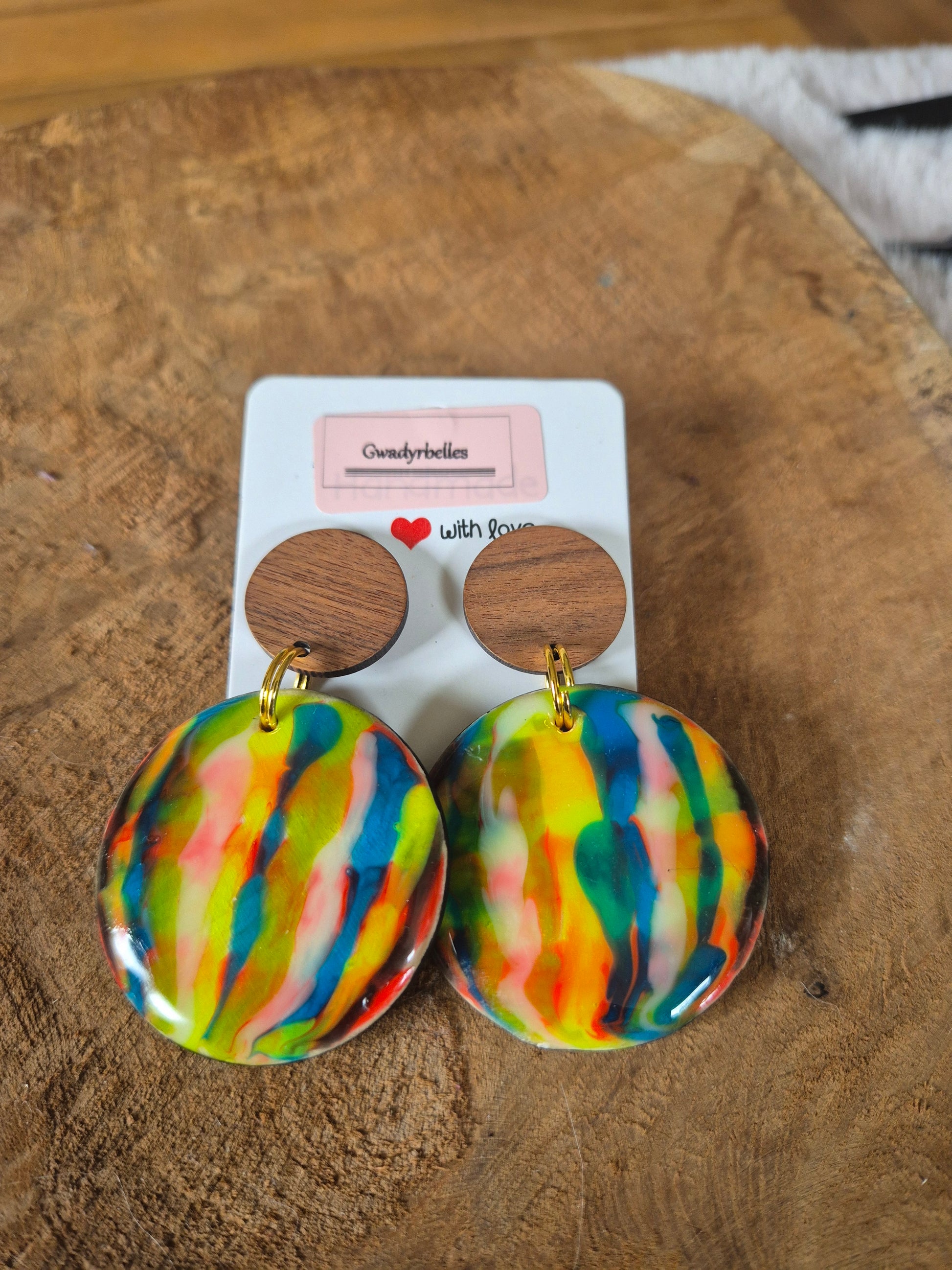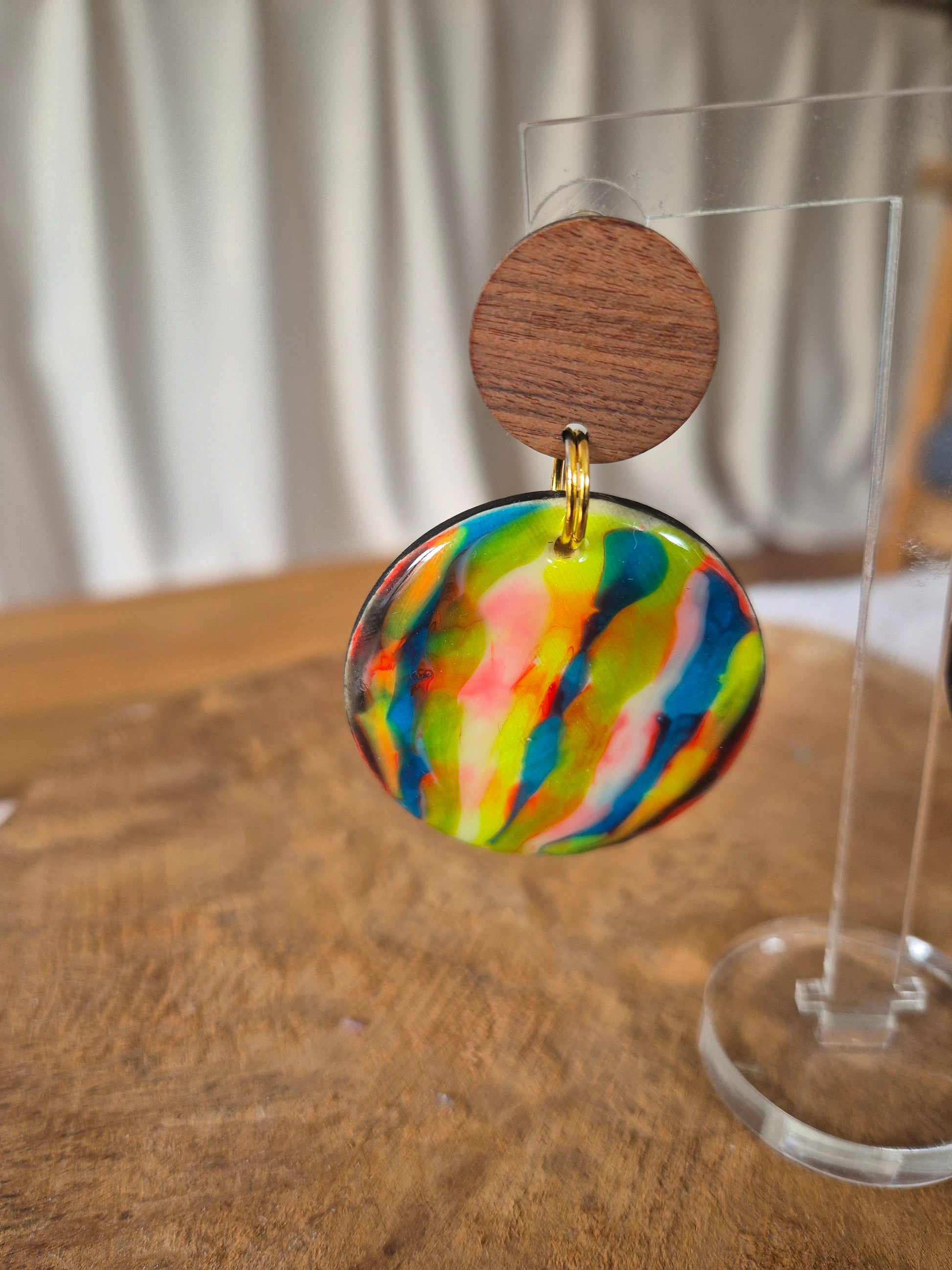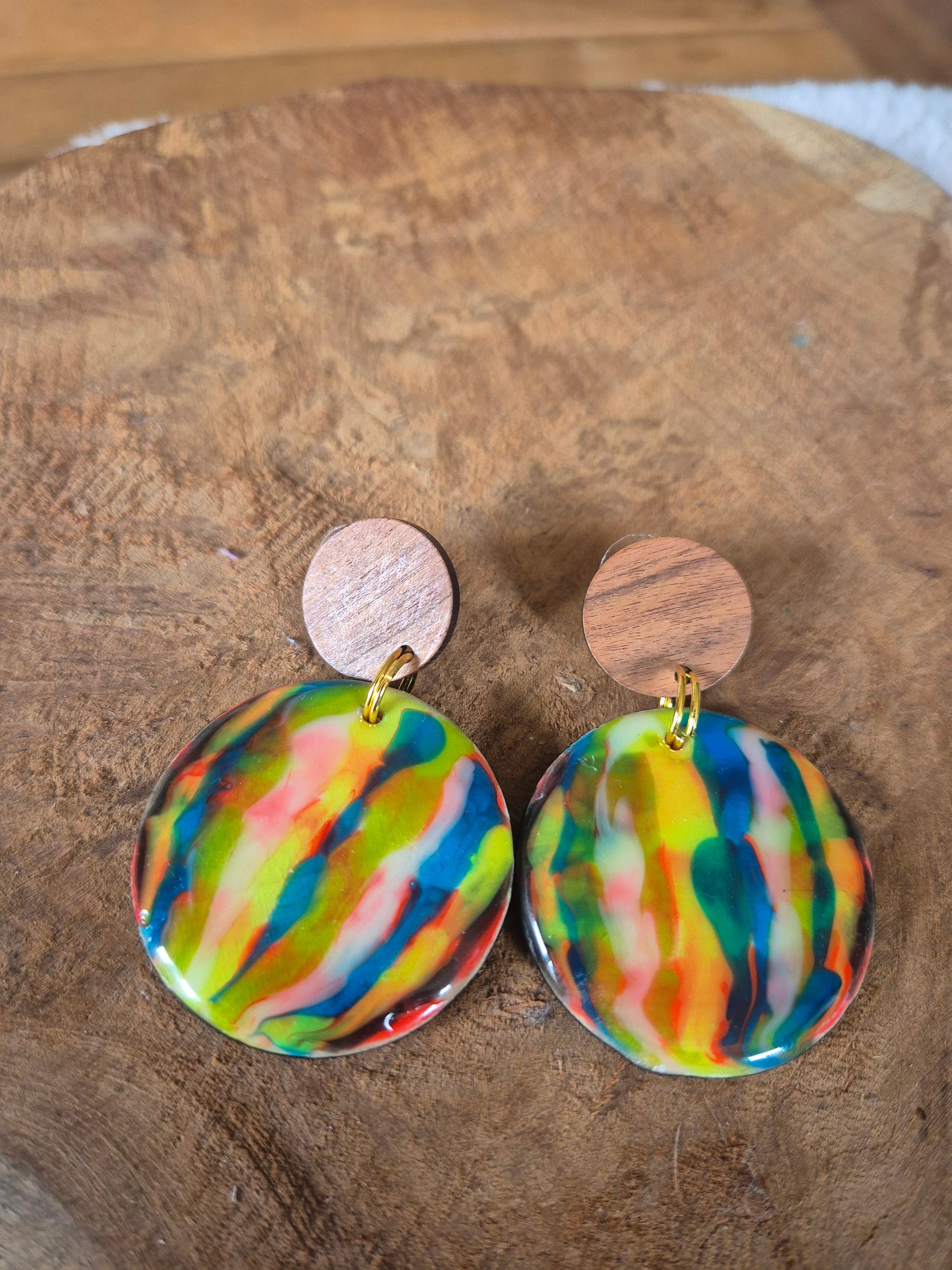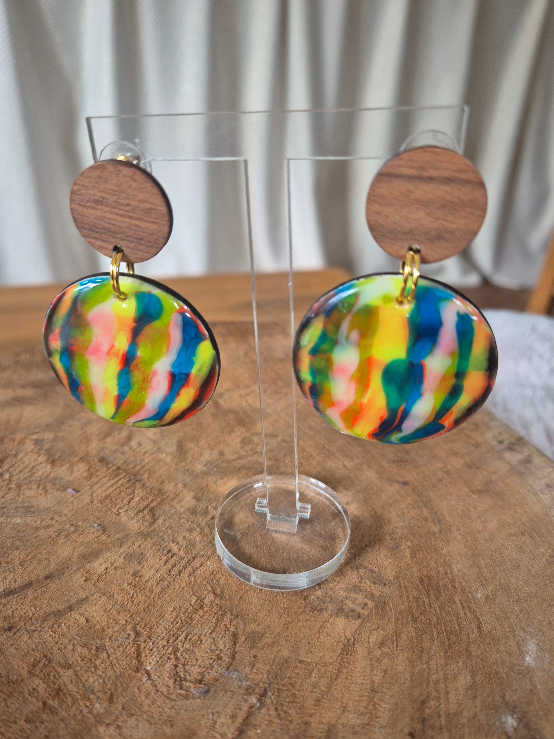 Boucles d'oreilles en bois et en résine coloré, mesurant 39 mm de diamètre. Longueur totale du bijou 60 mm de hauteur .