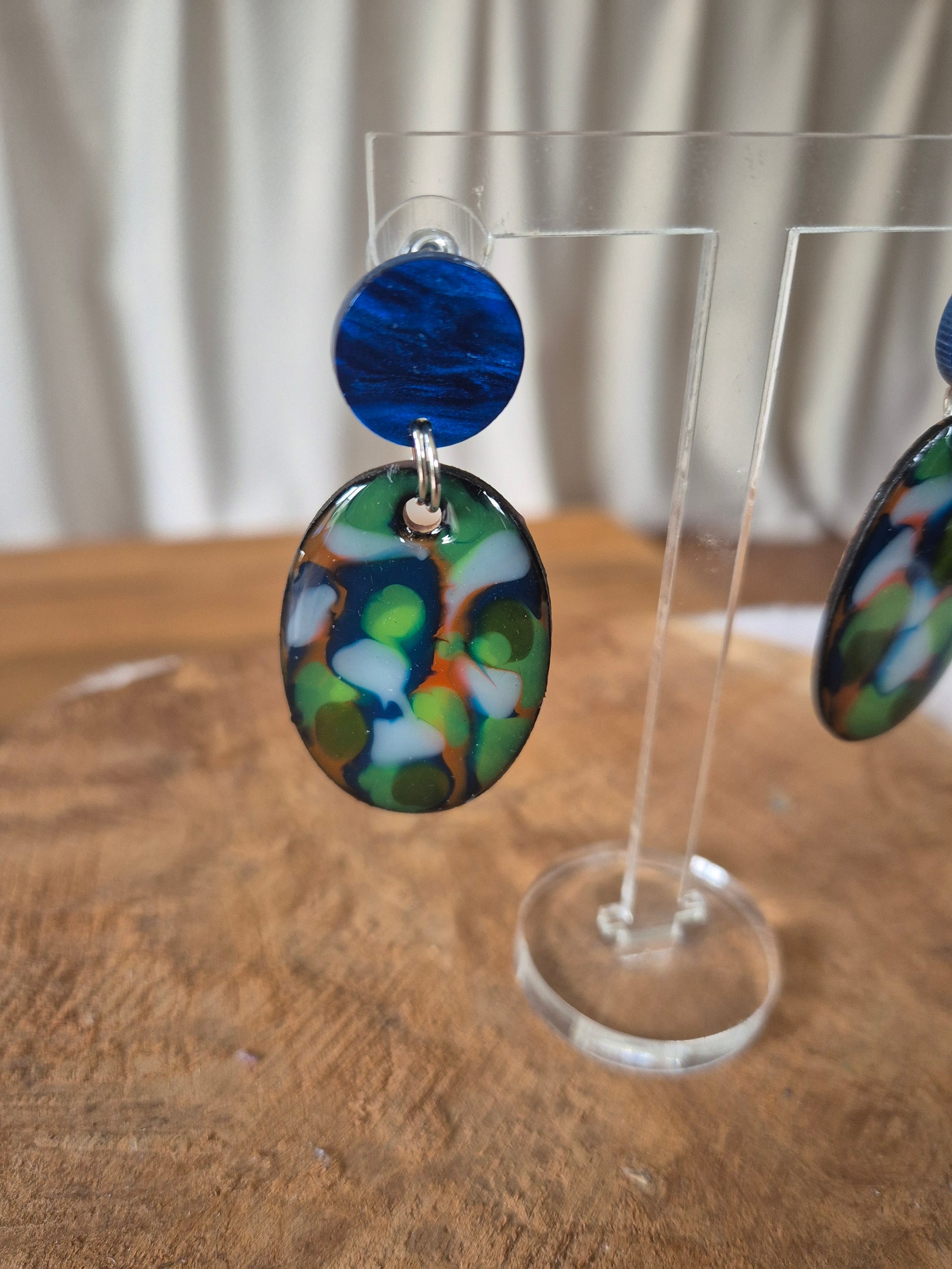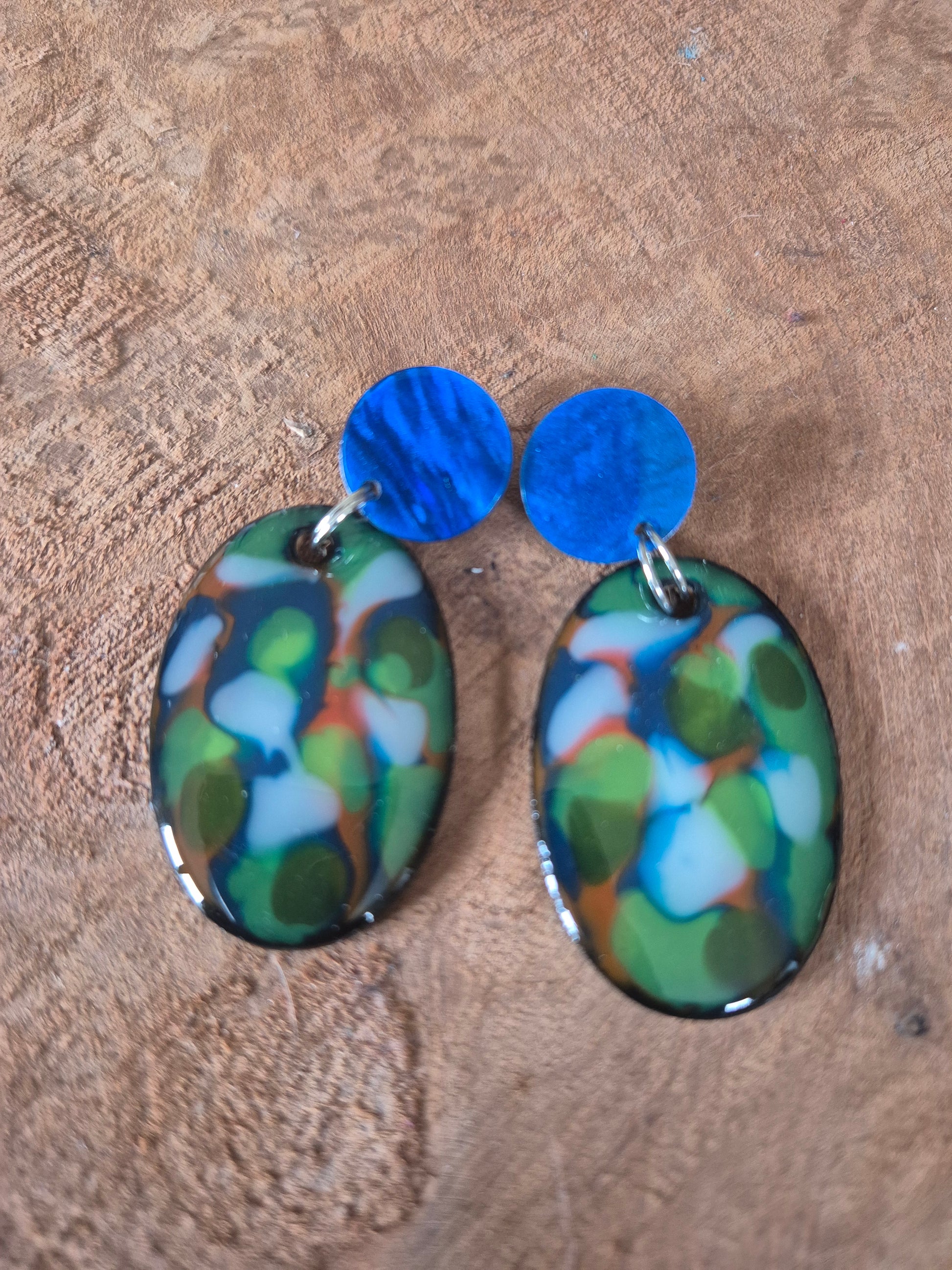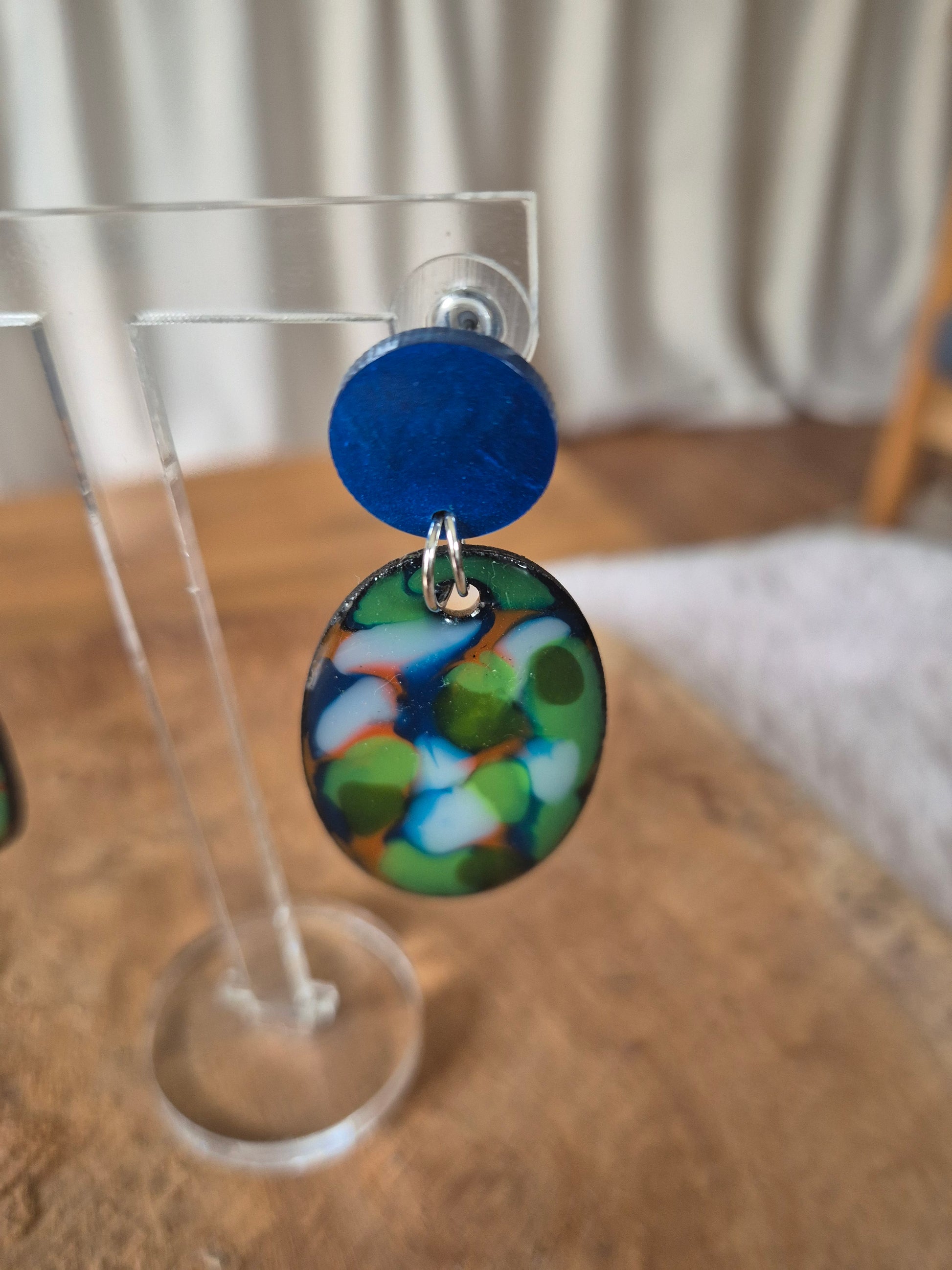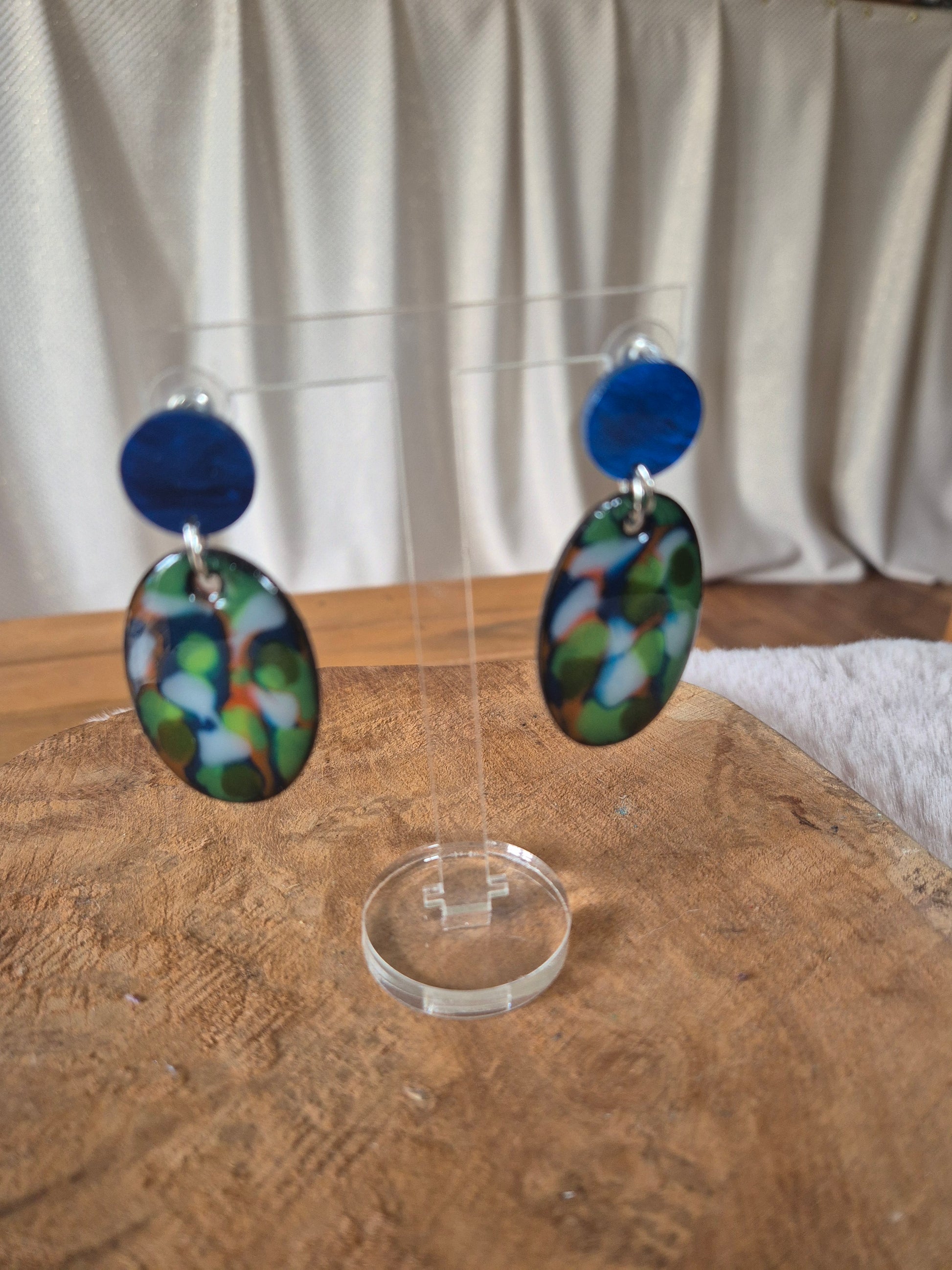 Boucles d'oreilles en bois et en résine coloré, mesurant 55 mm de hauteur et comprenant une largeur de 33mm.