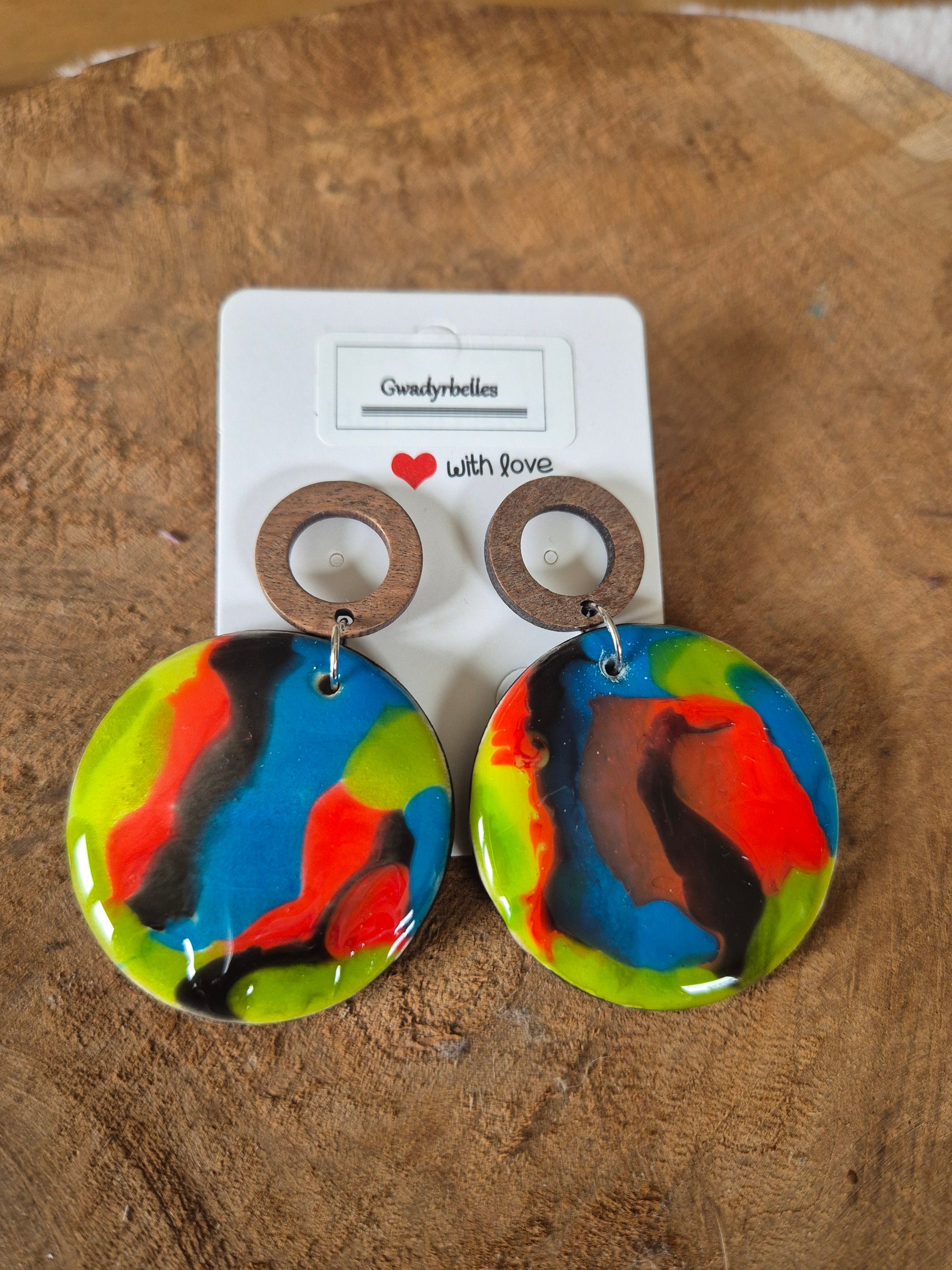 Boucles d'oreilles en bois et en résine coloré, comprenant une créole de 39 mm. Le bijou mesure 58 mm de hauteur.