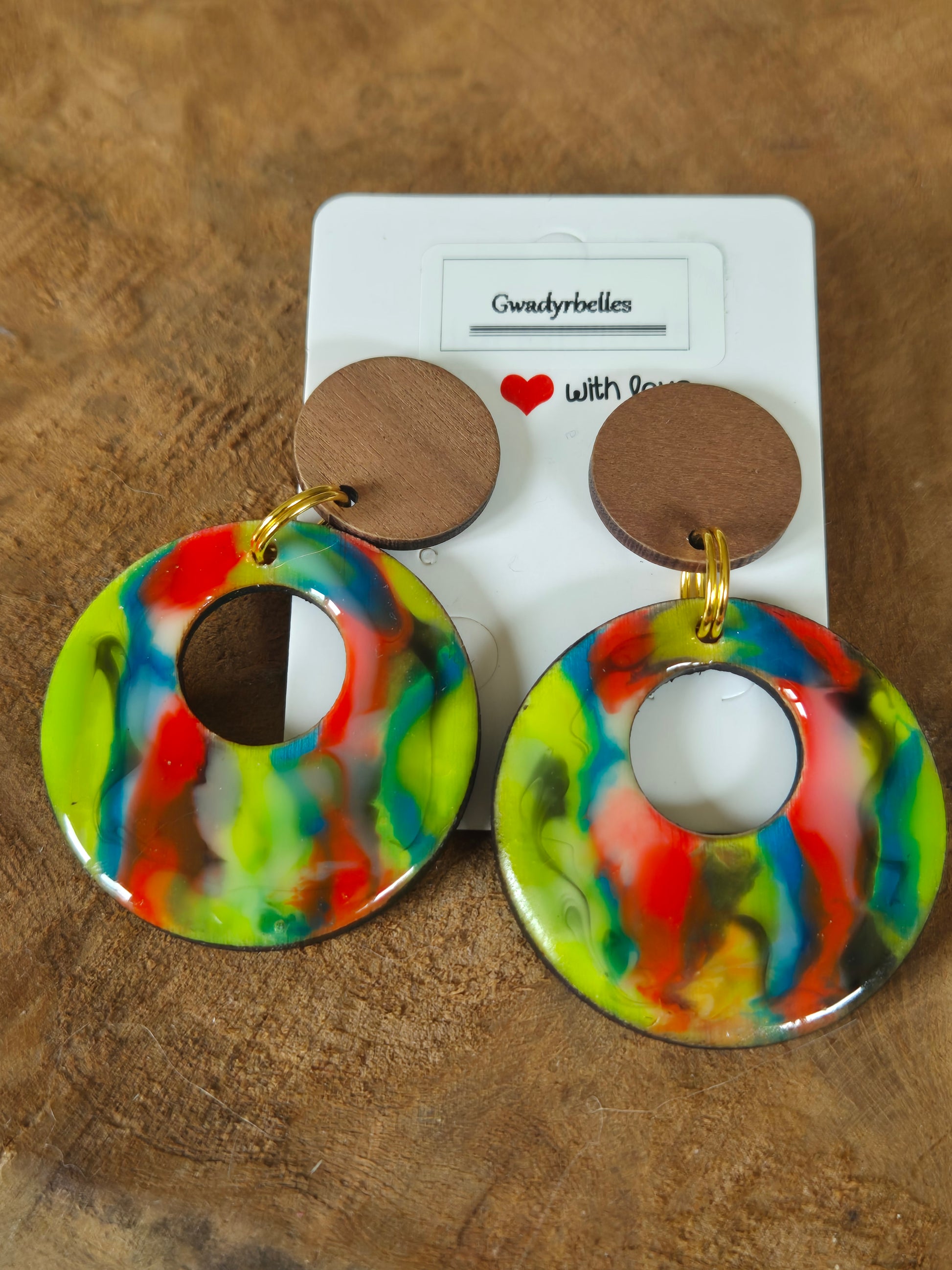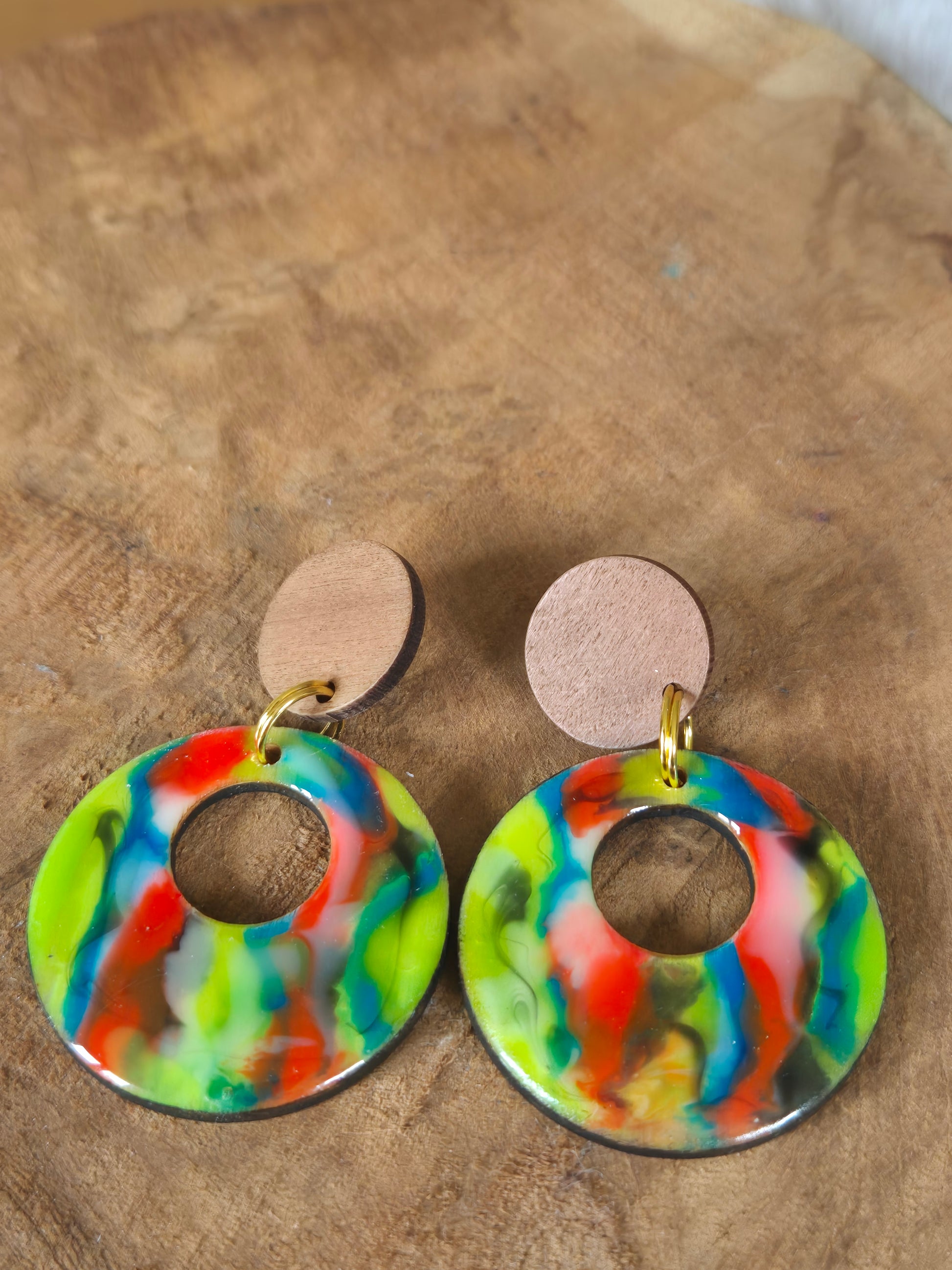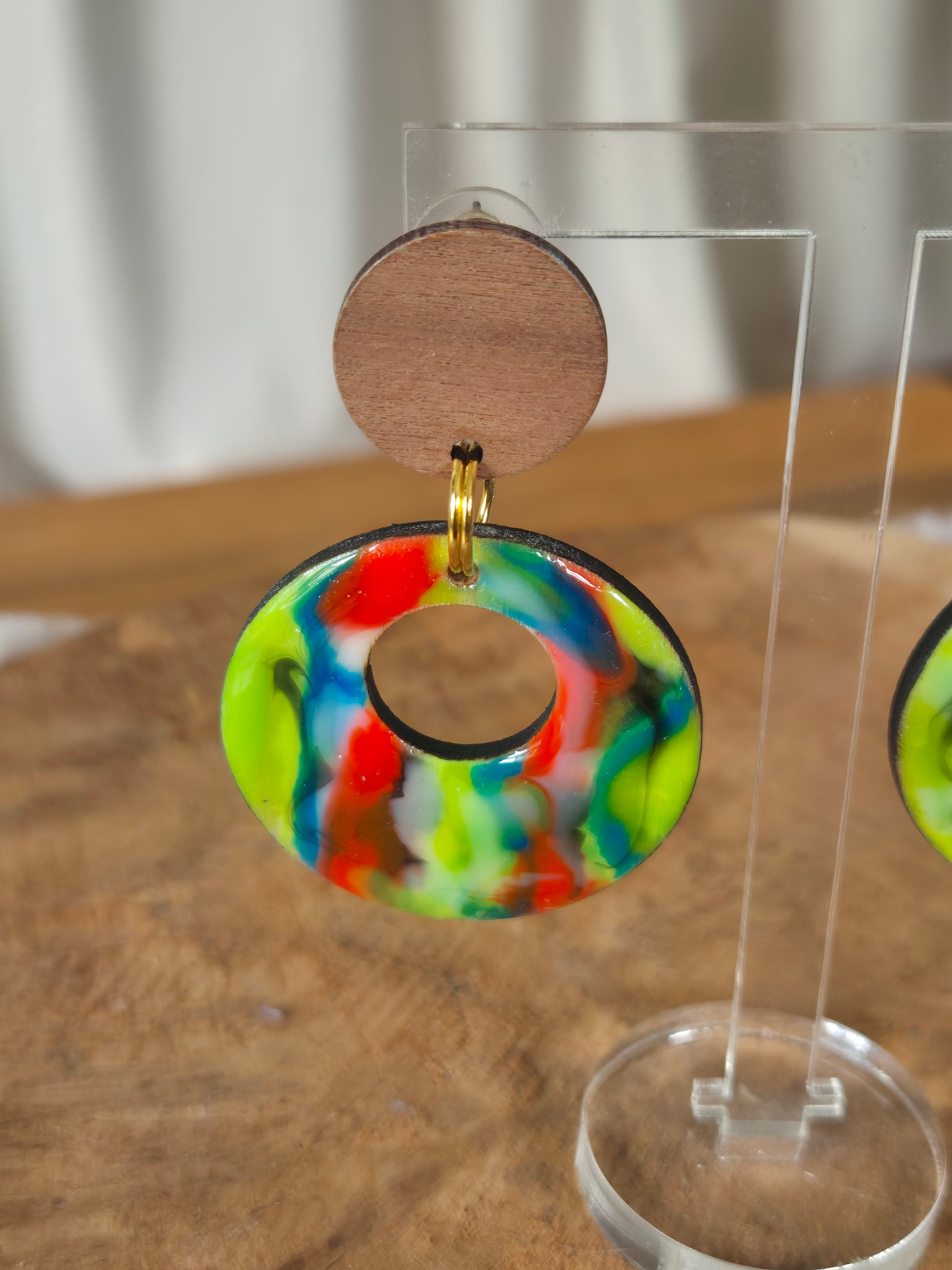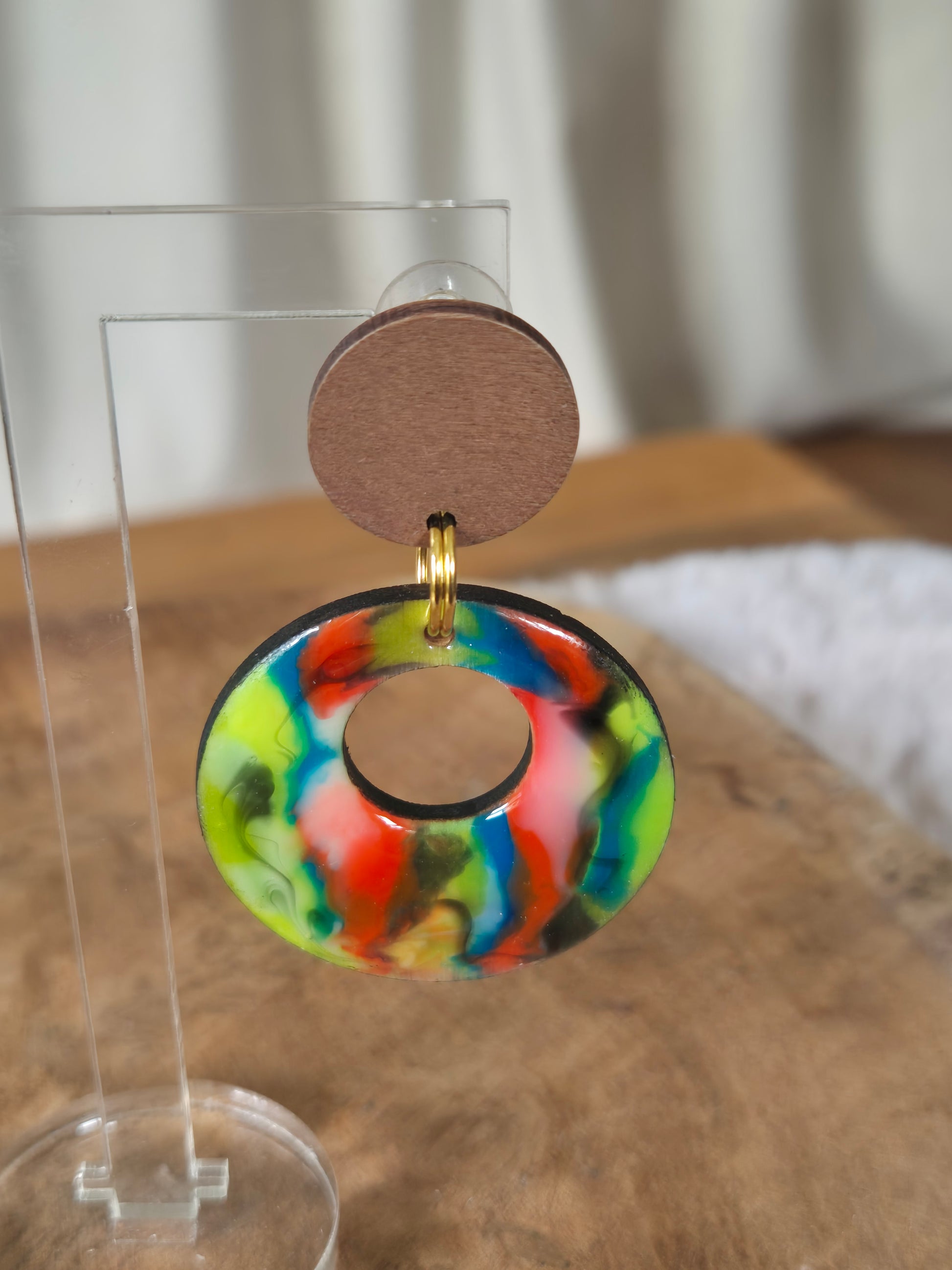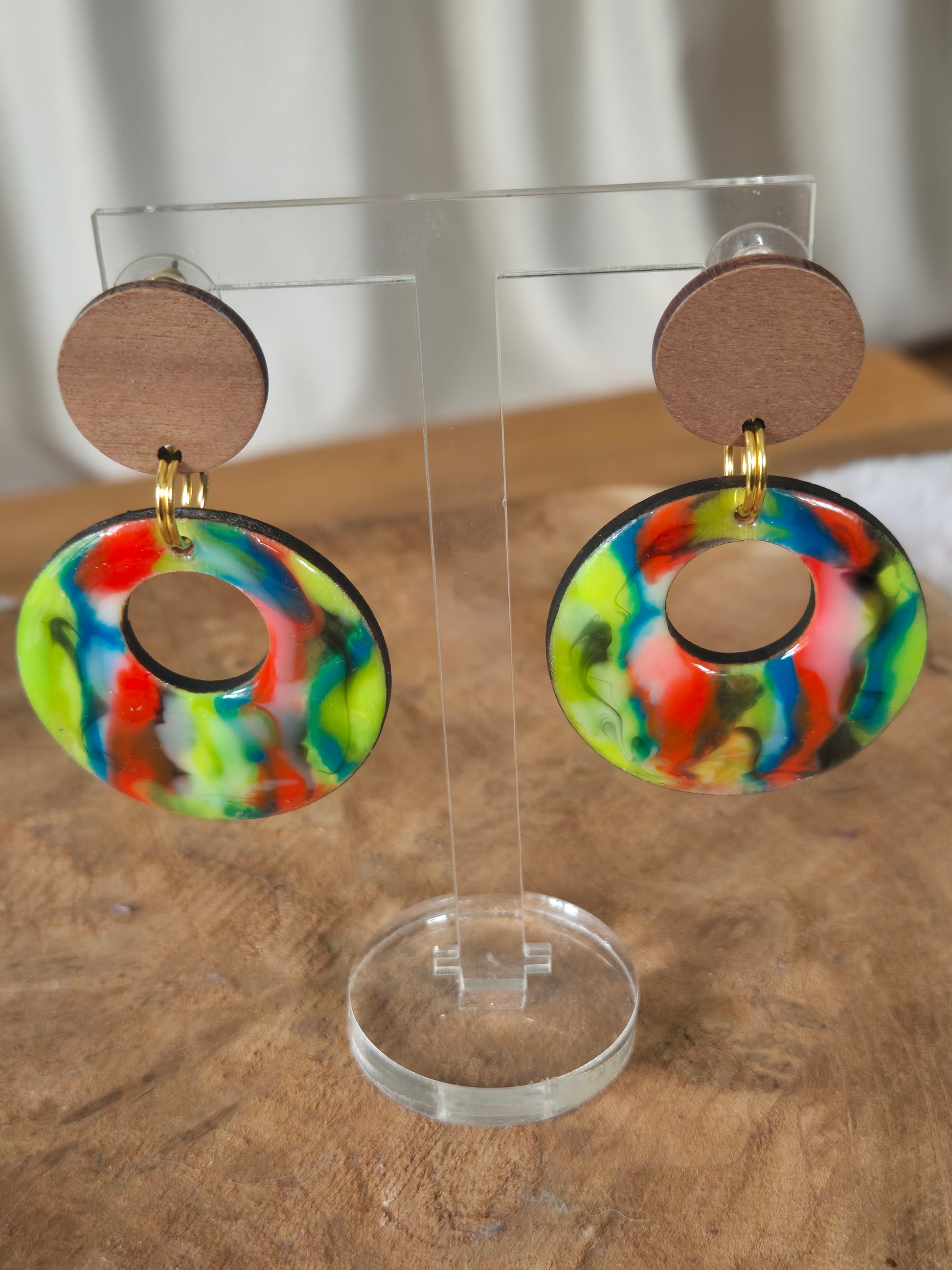 Boucles d'oreilles en bois et en résine coloré, comprenant une créole ajourée de 39 mm. Le bijou mesure 60mm de hauteur.