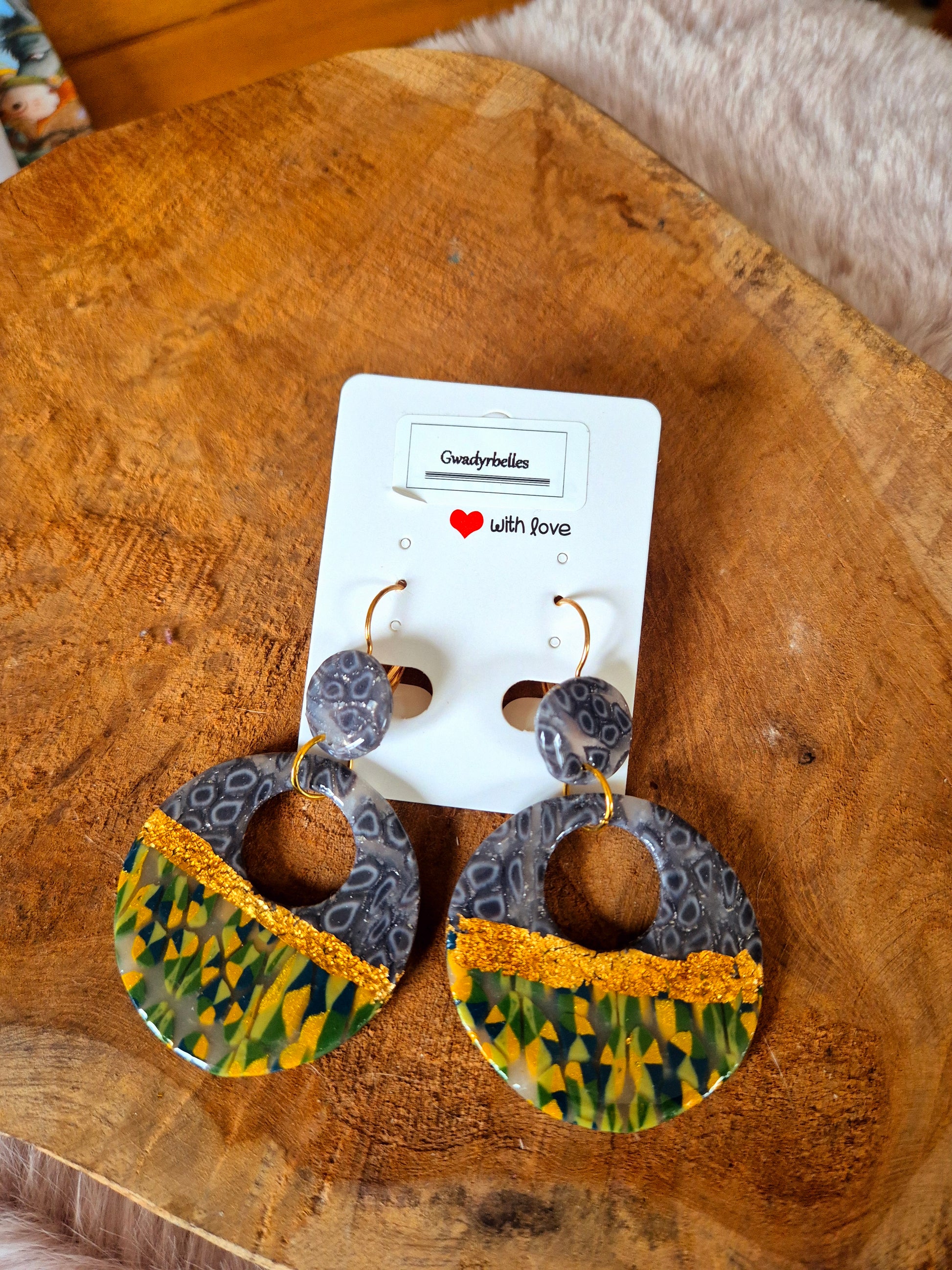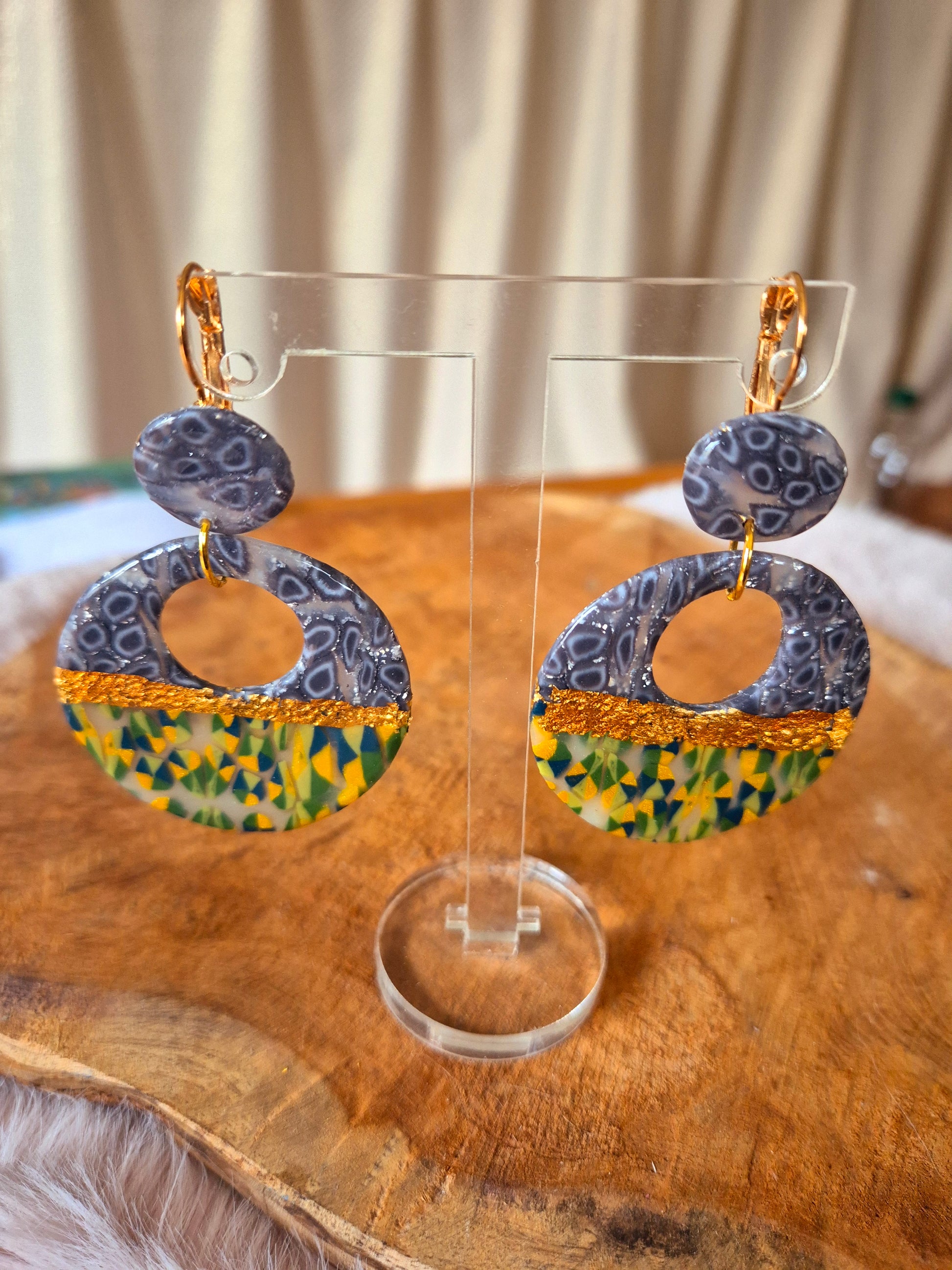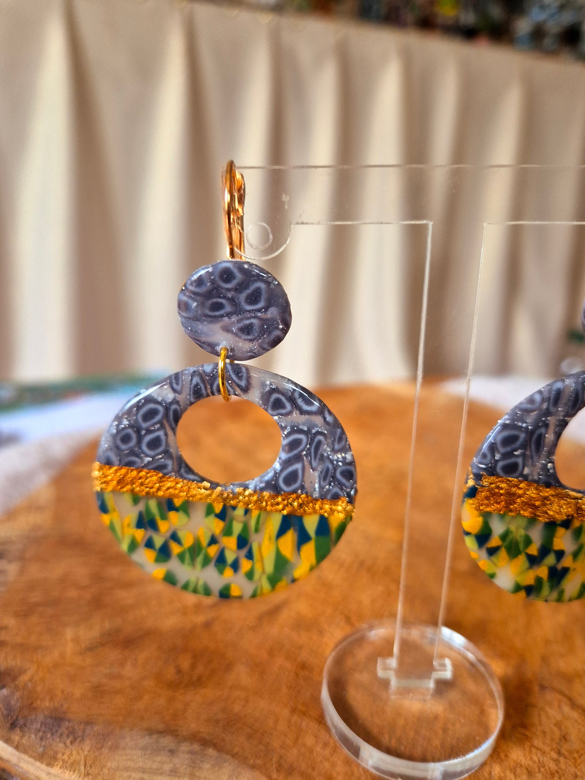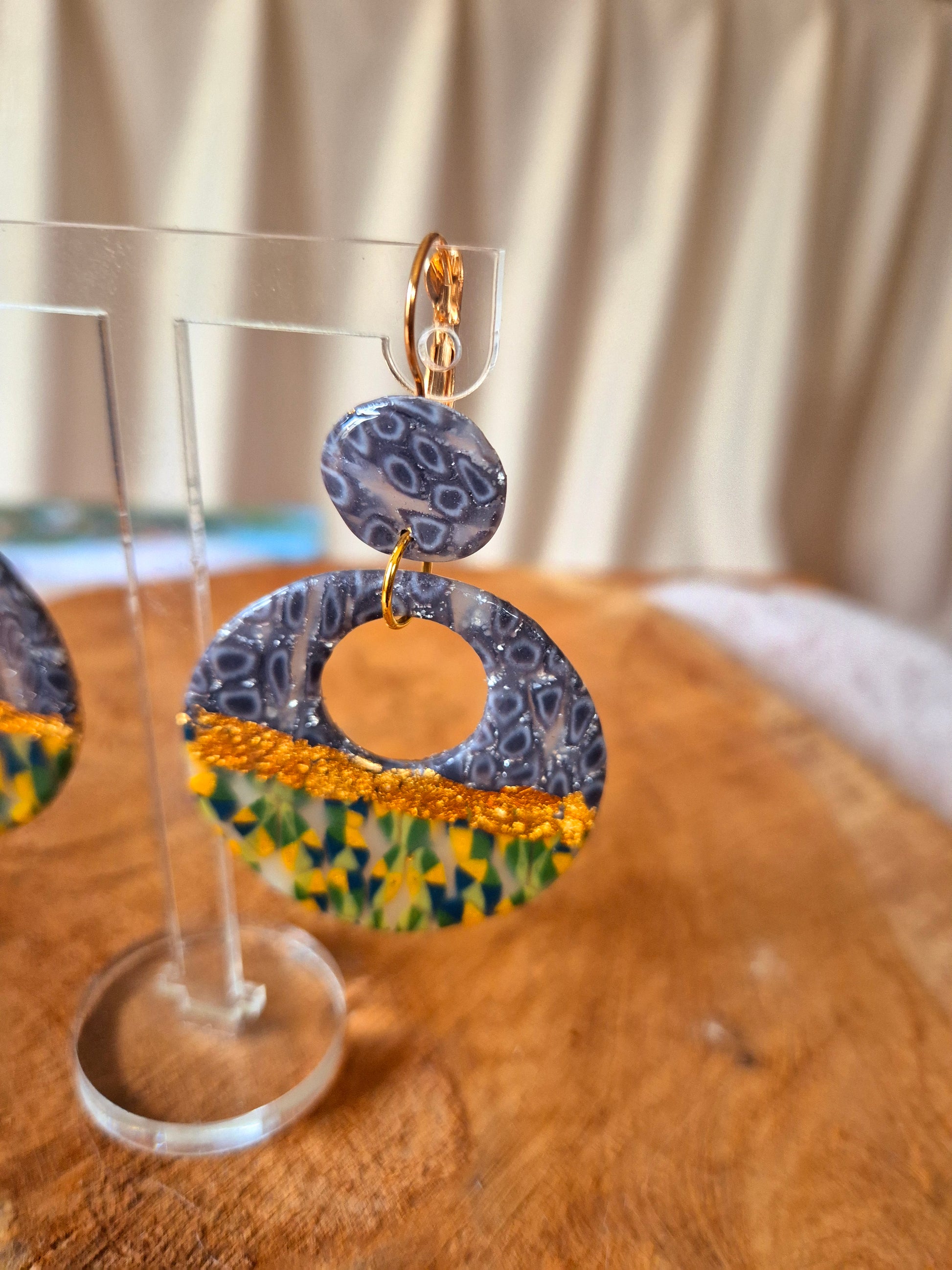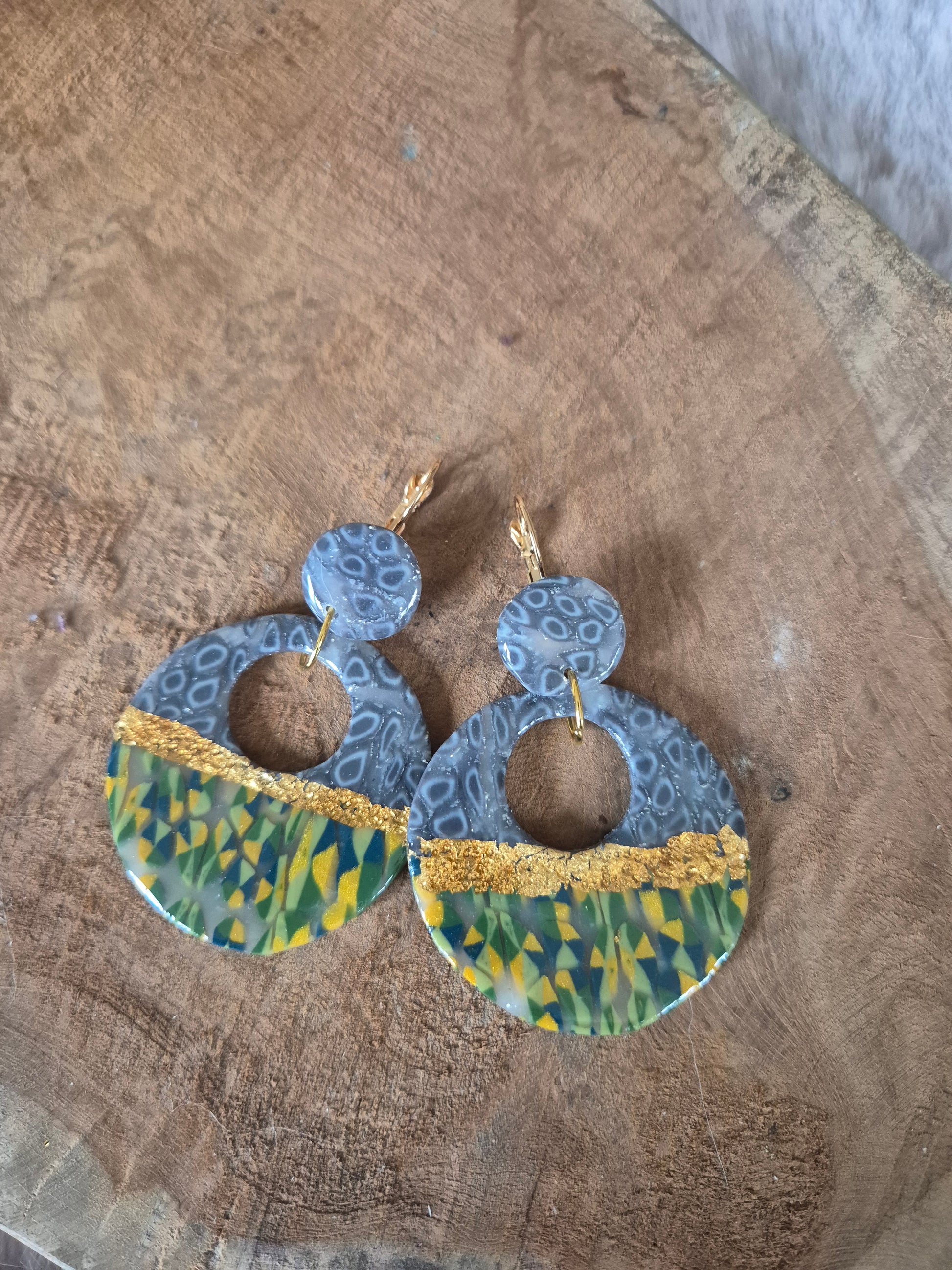 Voici les magnifiques boucles d'oreilles en pâte polymère ! Elles se déclinent en deux couleurs distinctes séparées par une bande dorée. Avec son pendentif ajouré en forme de cercle de 43mm de diamètre, elles mesurent au total 70mm de longueur.