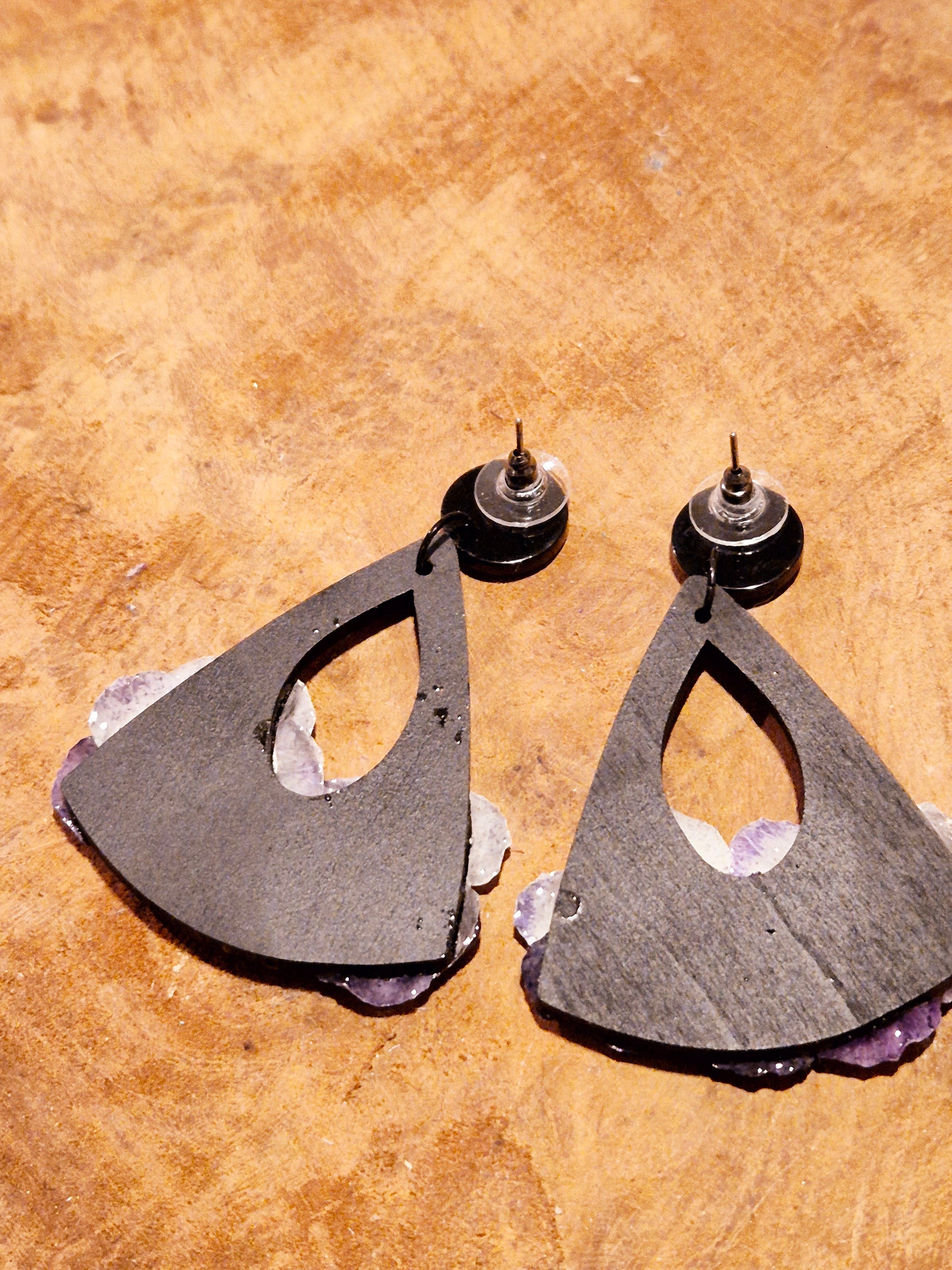 Obtenez un look élégant avec notre bijou, "Ma violette". Avec une hauteur de 66mm et une base de 42mm, ce bijou triangulaire en bois noir est orné de fleurs incrustées et d'une finition résine. Ajoutez une touche de sophistication à votre tenue avec ce bijou unique.