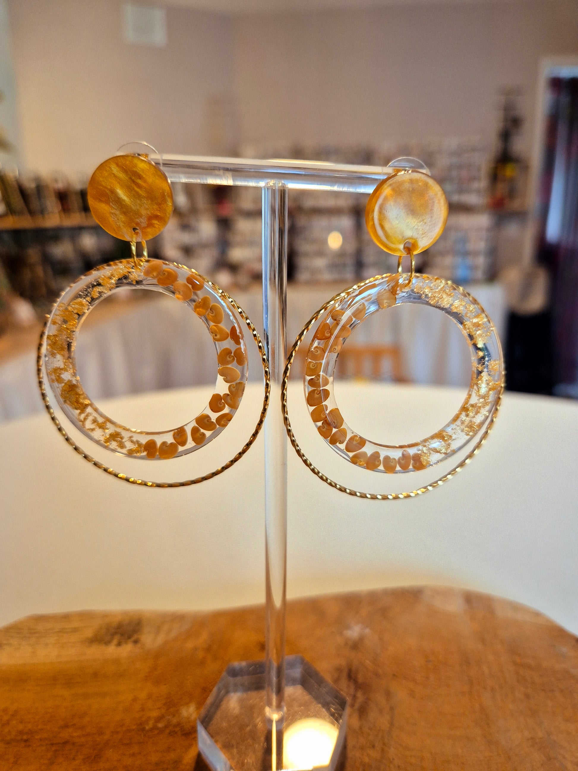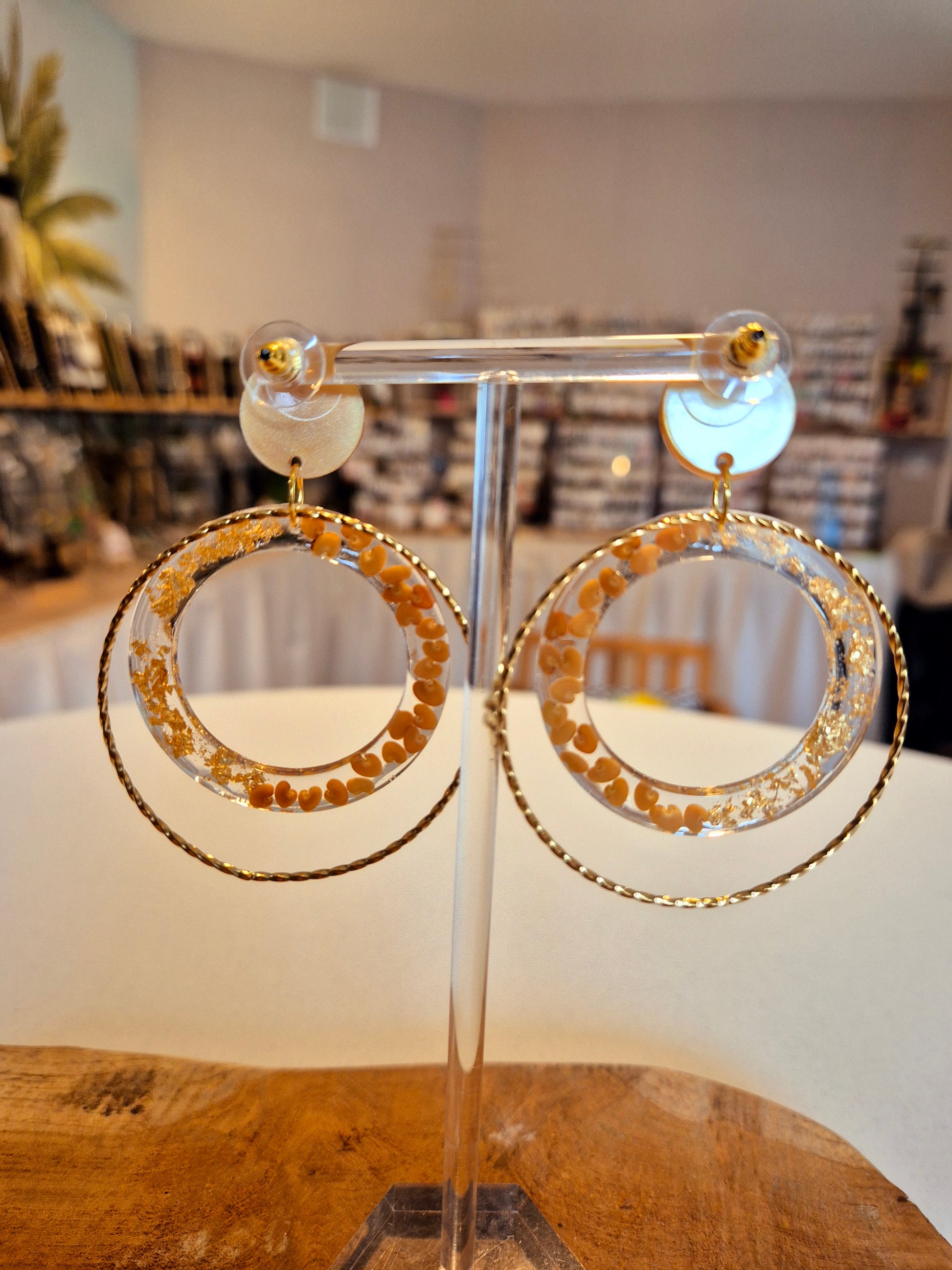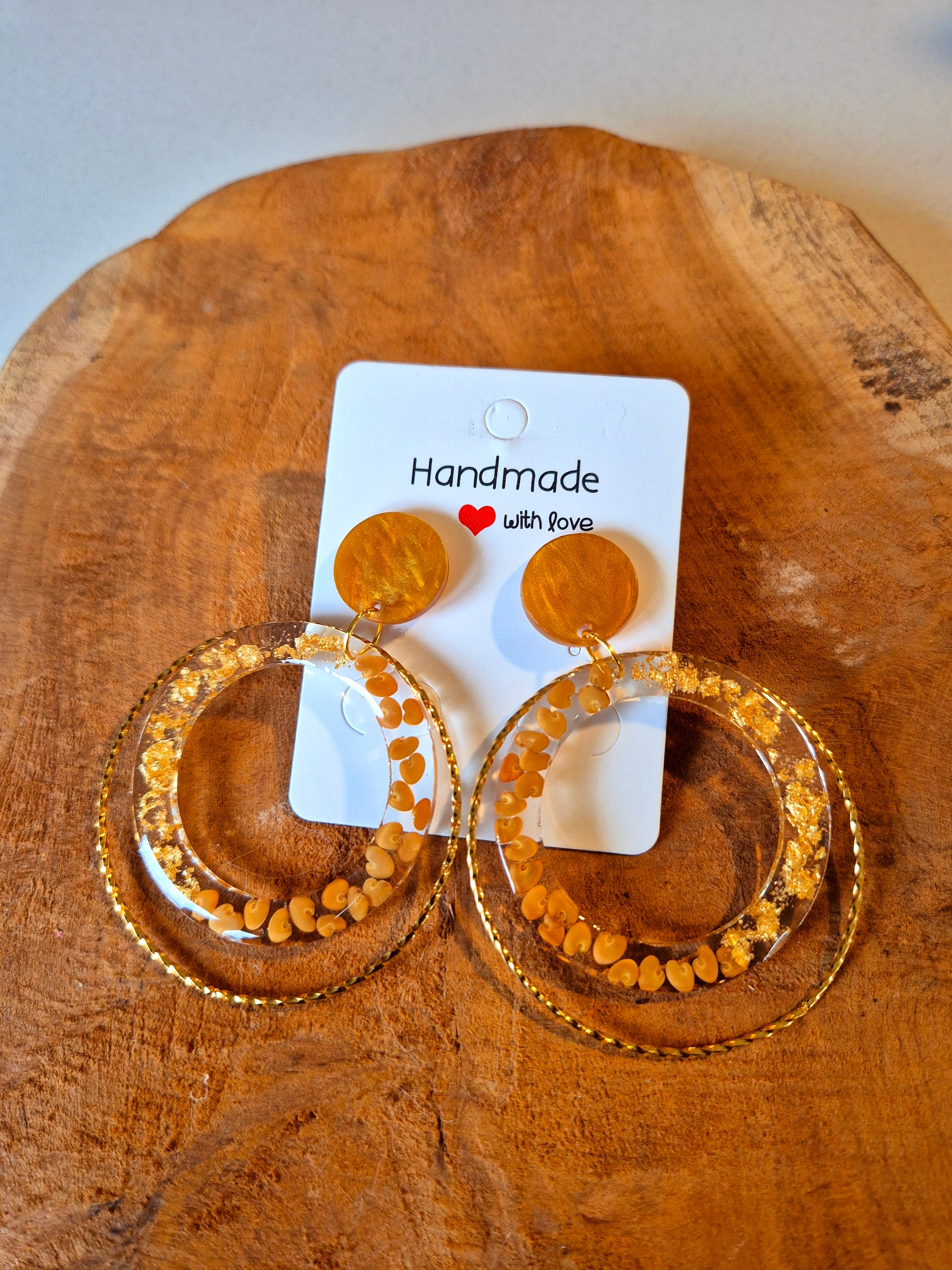 Ces magnifiques boucles d'oreilles en cercle doré inoxydable mesurent 49mm de diamètre, et sont agrémentées d'un cercle en résine de 40mm de diamètre et avec une hauteur totale de 70mm.Les apprêts en acrylique ajoutent une touche élégante et tendance à toute tenue. Parfaites pour un look professionnel et moderne.