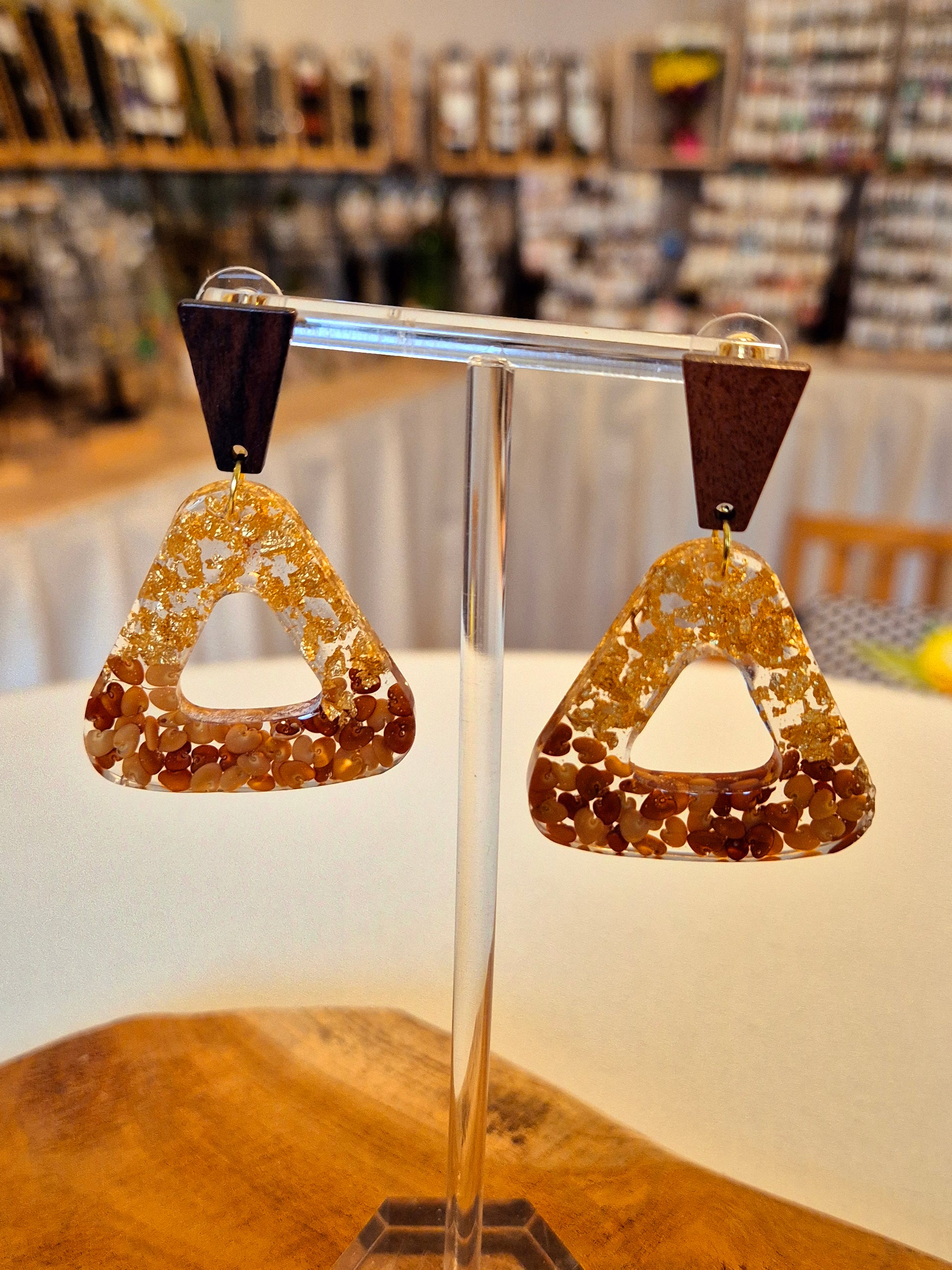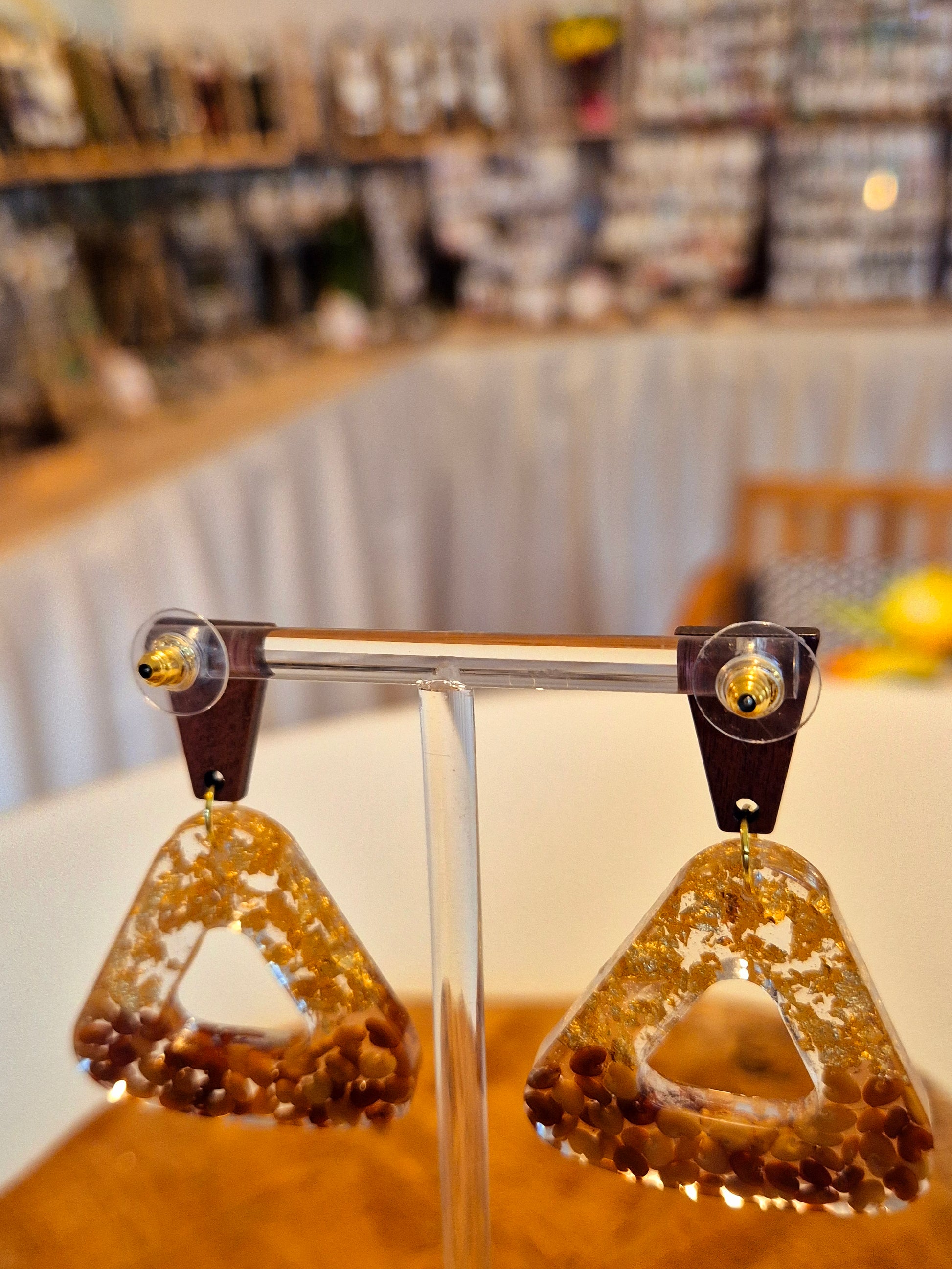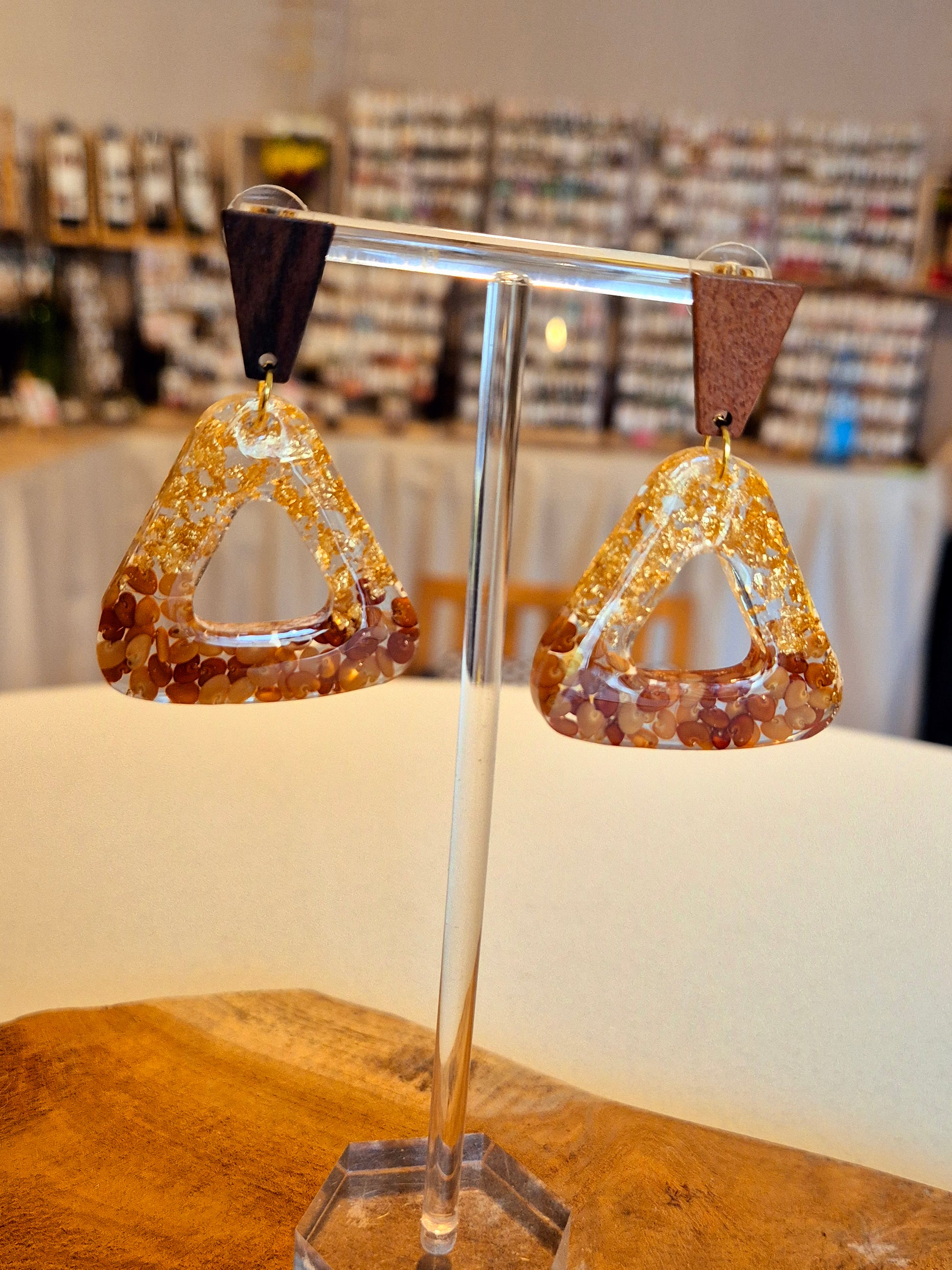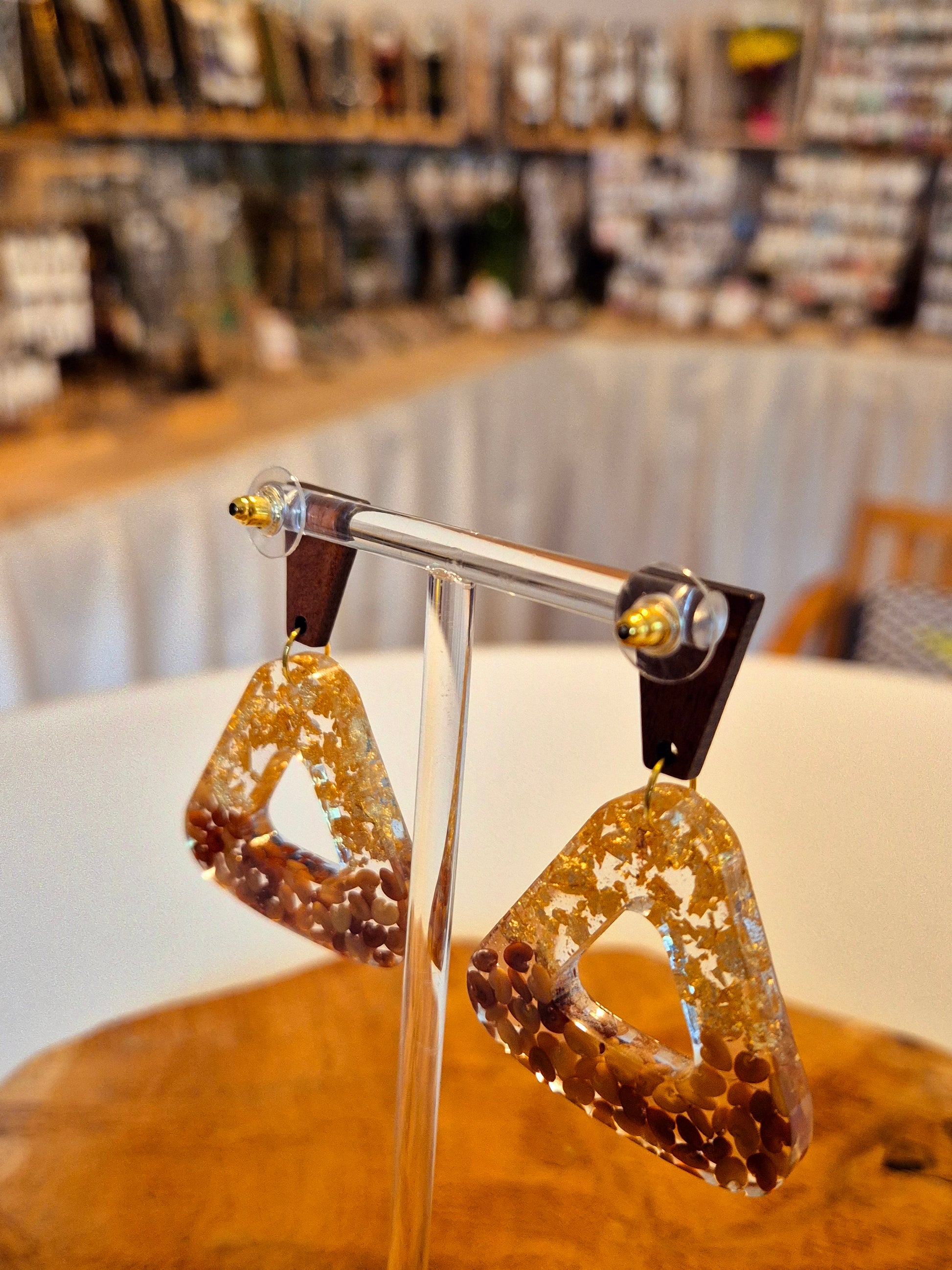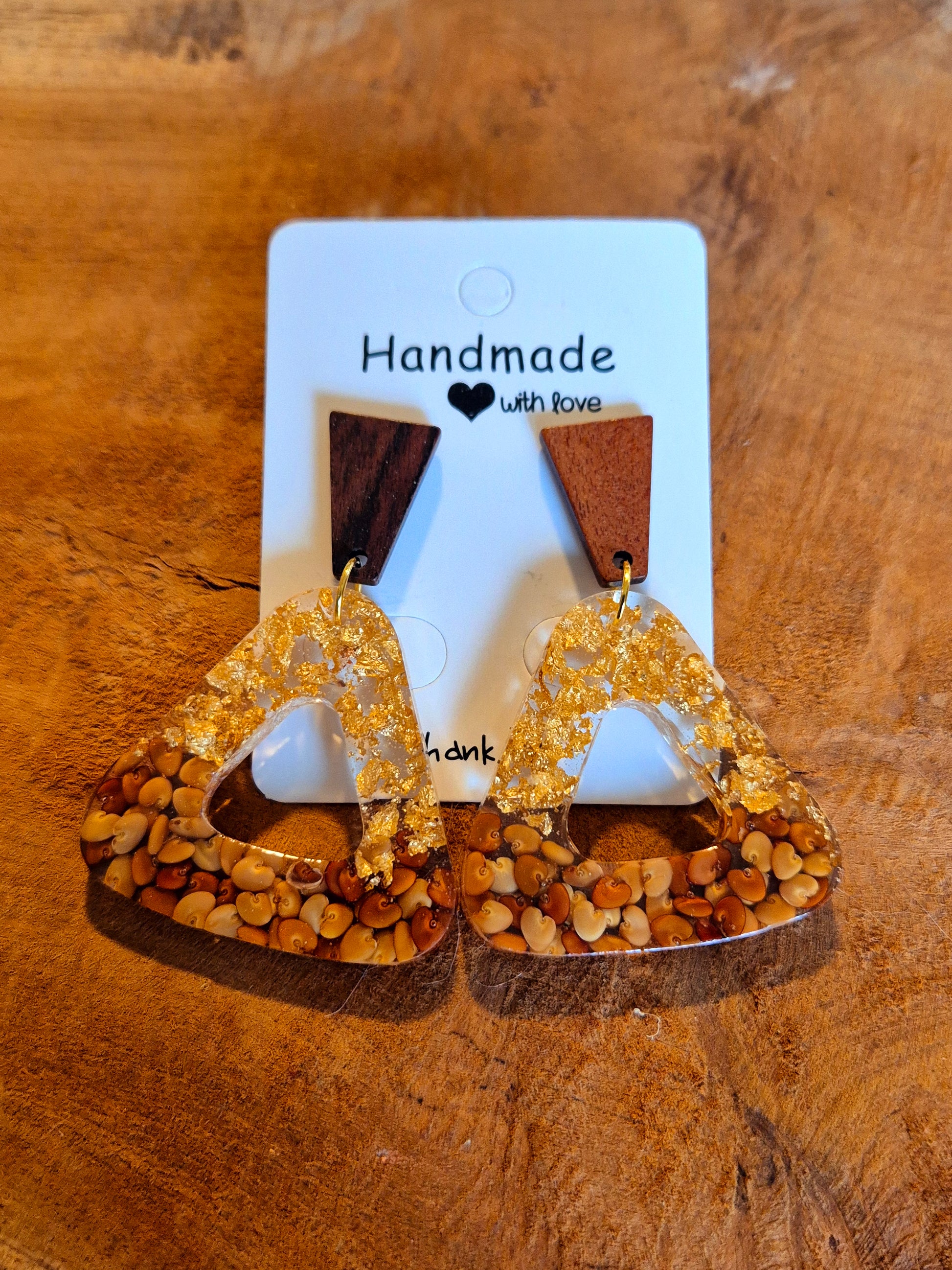 Découvrez nos boucles d'oreilles uniques incrustées de graines exotiques et de feuilles d'or. Avec leur forme triangulaire en résine, elles allient élégance et originalité. Surmontées d'un apprêt en bois triangulaire de 18mm, elles sauront vous faire briller à toute occasion.