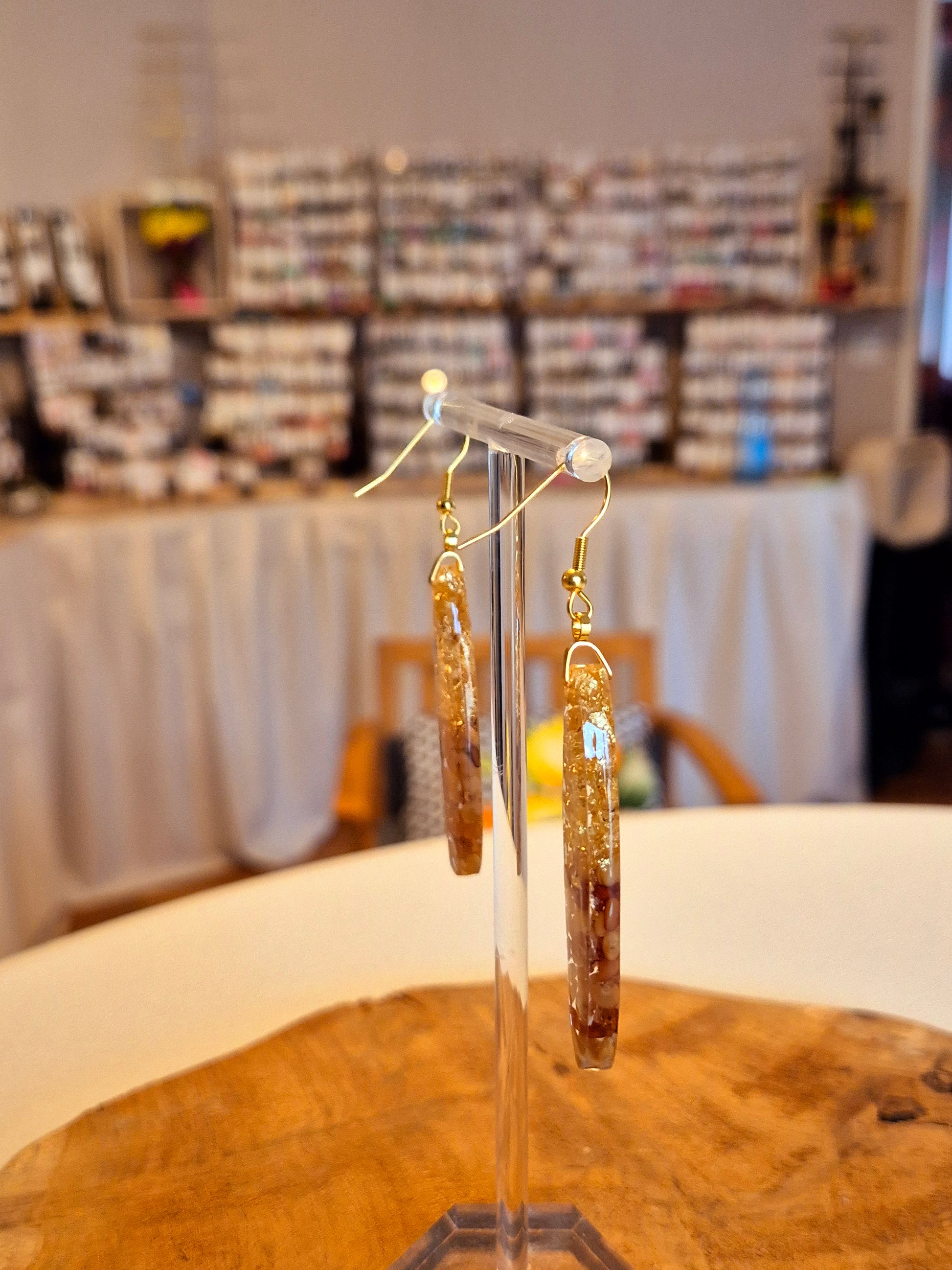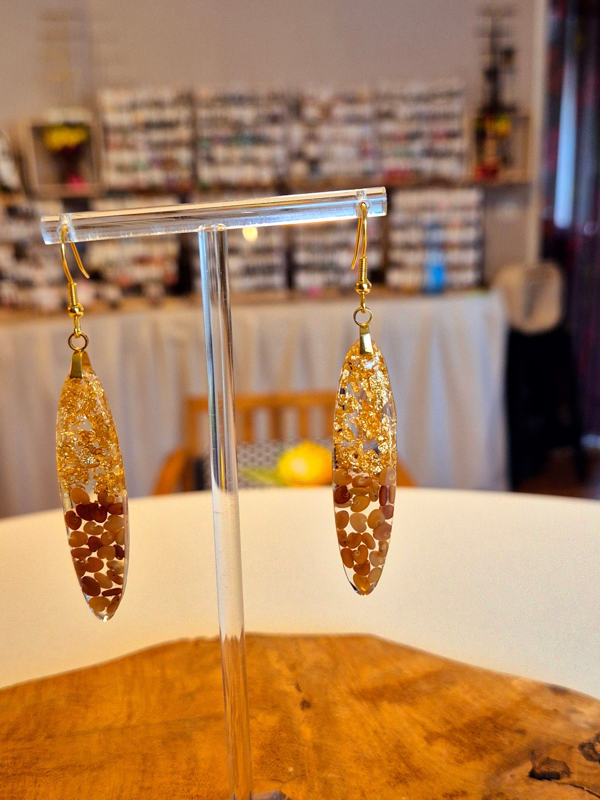 Les boucles d'oreilles "Double jeu " vous surprendront par leur design unique. Fabriquées avec de la résine et des matériaux naturels tels que des graines exotiques et des feuilles d'or, elles sont également dotées d'un appret en acier inoxydable doré pour une qualité durable. Mesurant 50mm de hauteur, ce bijou est un véritable chef d'oeuvre à ajouter à votre collection."