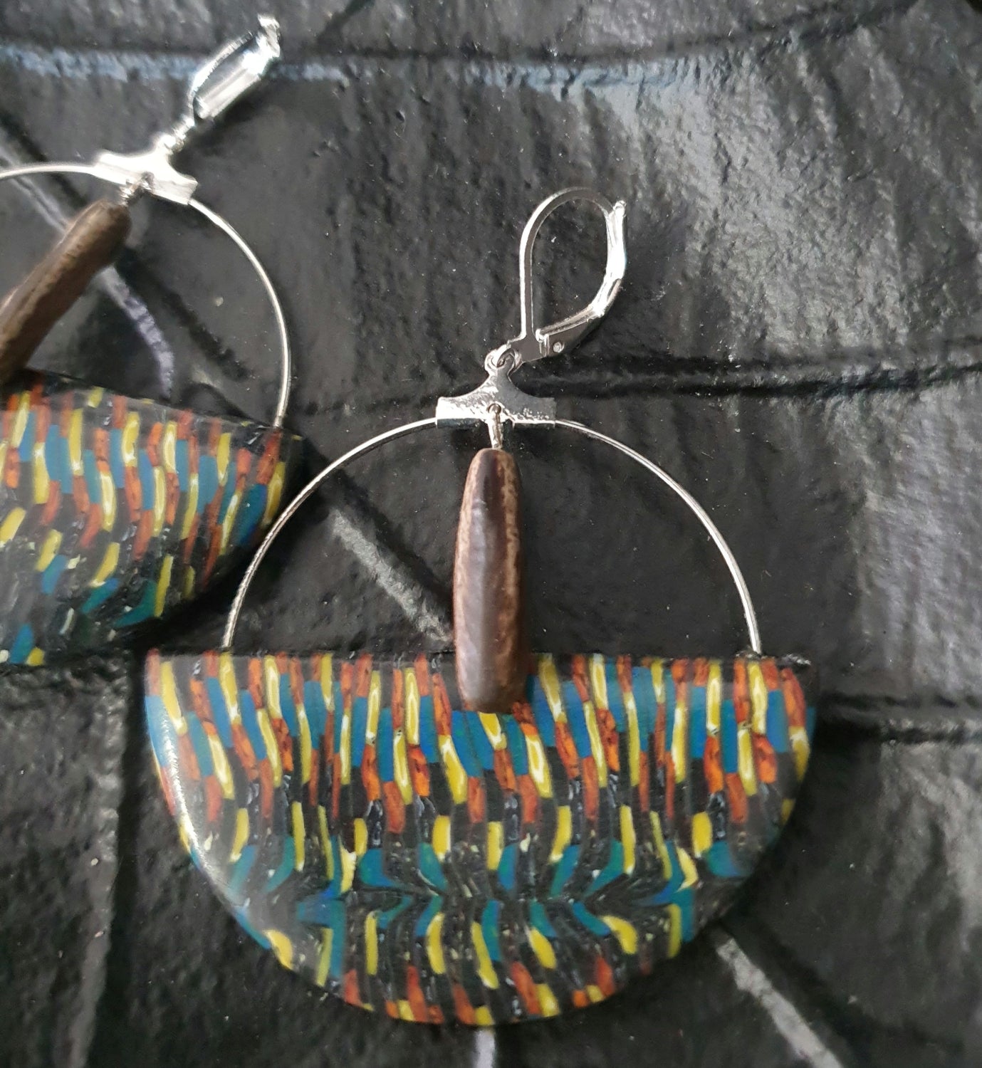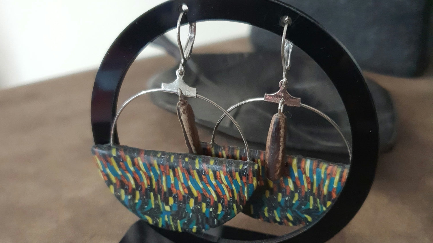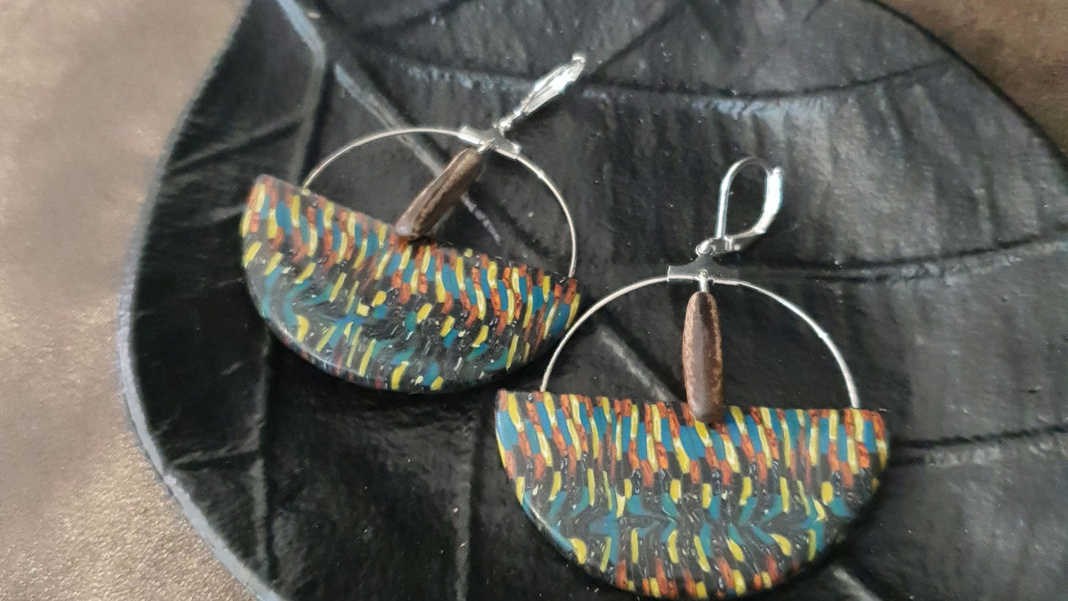 Demi cercle polymère de 48.8mm de diam. Monté sur support métal couleur argent+ graine exotique( flamboyant)