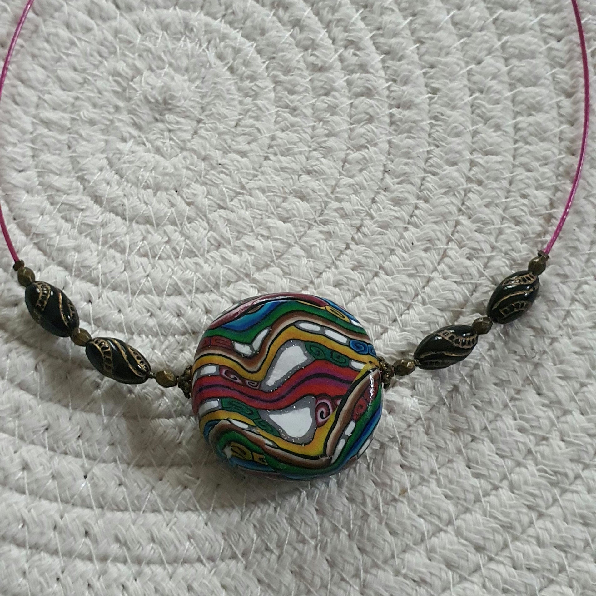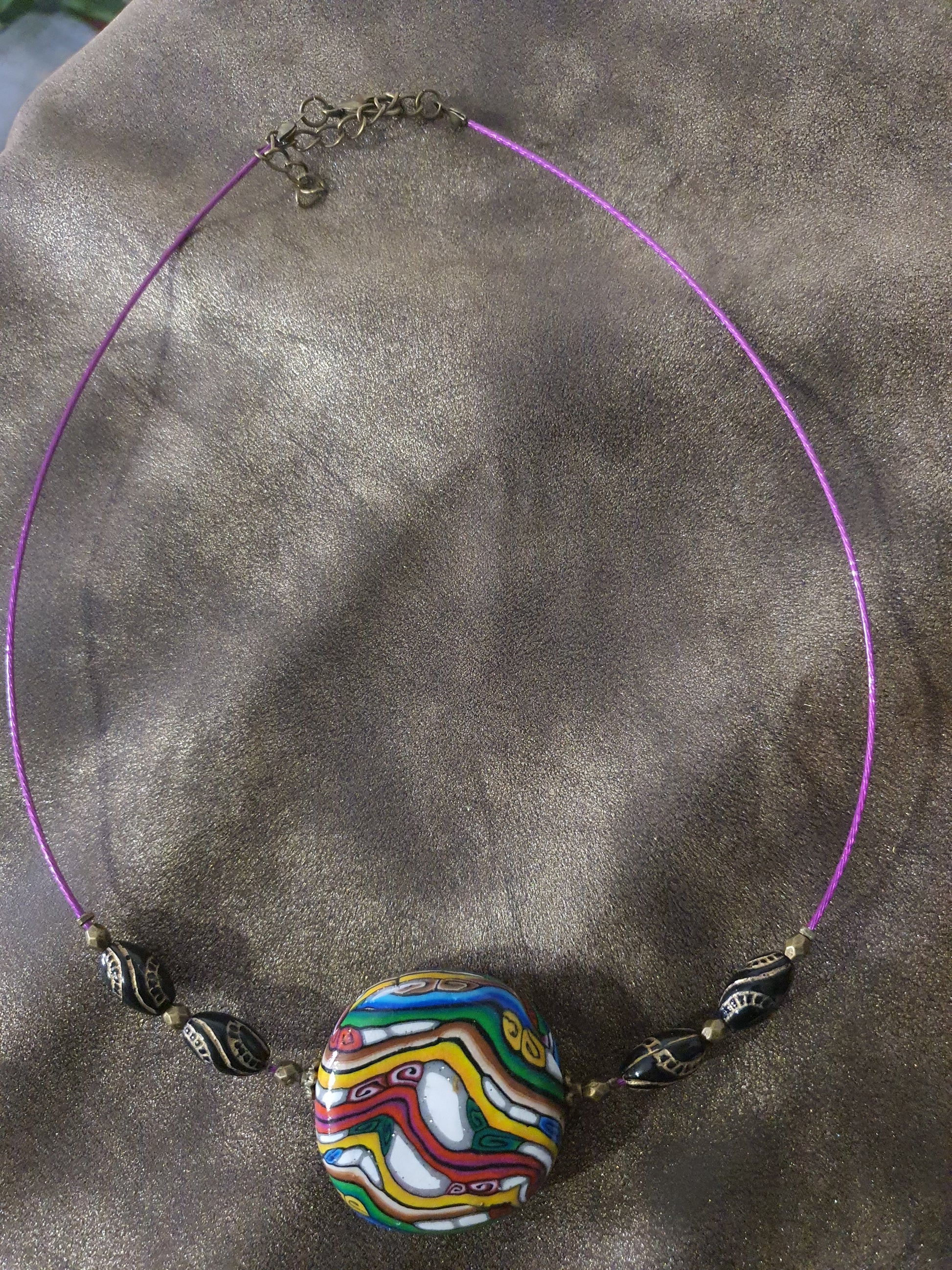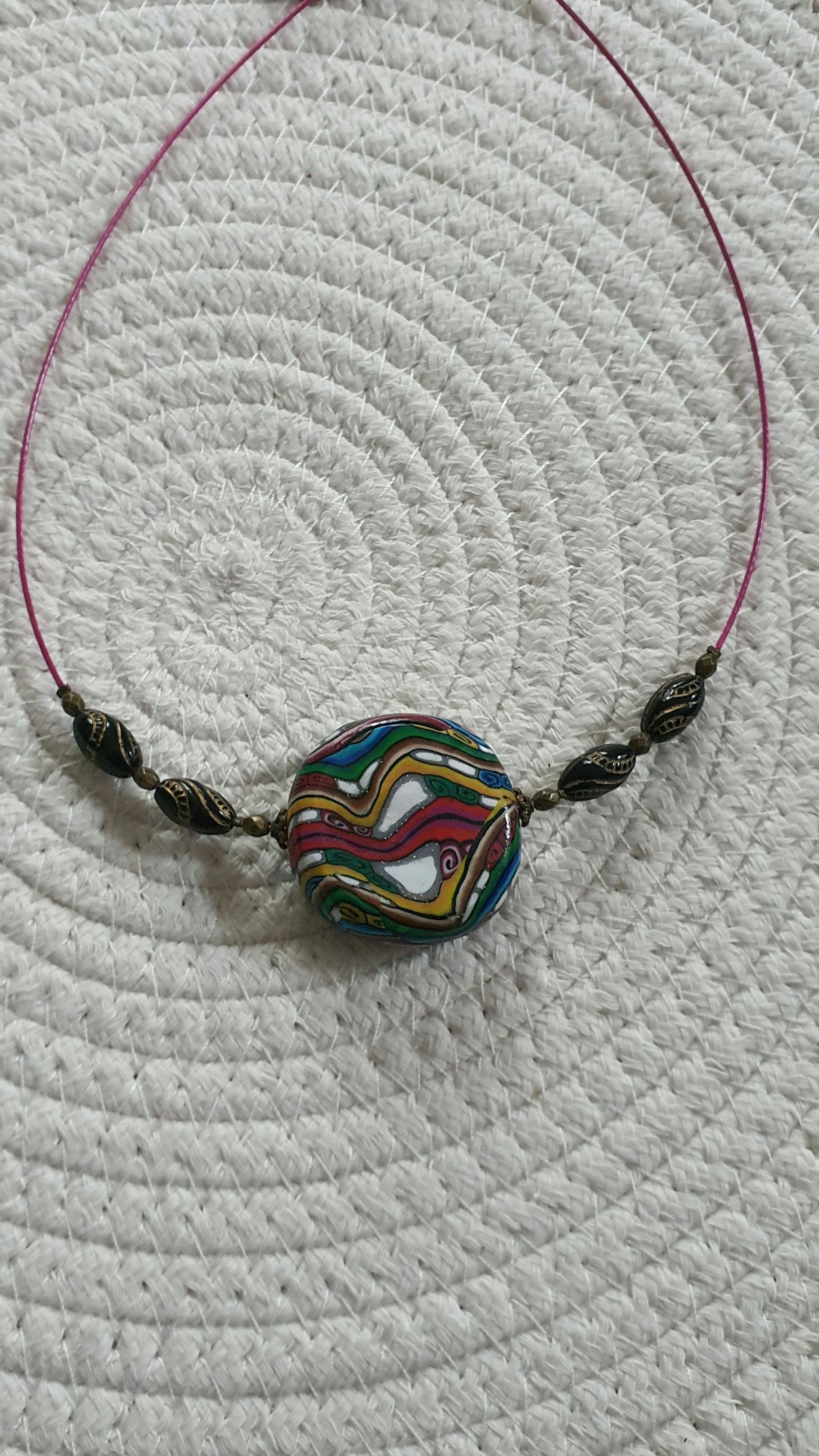 Ce collier est magnifique avec un pendentif polymère de 36mm monté sur câble. Il est accompagné de 4 perles en bois et 6 perles en métal en bronze, avec un fermoir en bronze. Ajoutez une touche de style et d'élégance à votre tenue avec ce collier unique et tendance.
