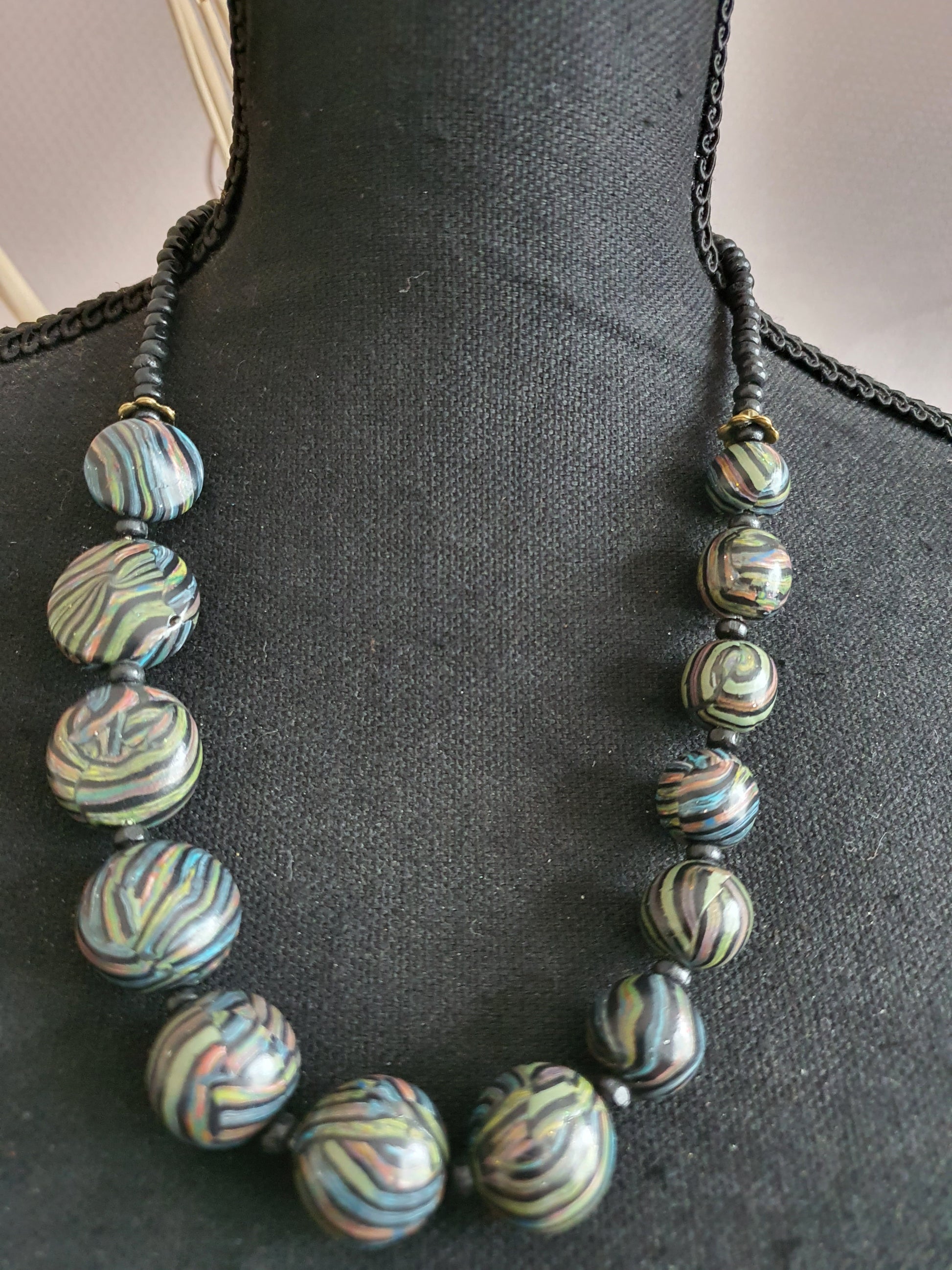 Ce splendide Collier est composé de 13 perles en polymère et monté sur un fil câblé, orné de perles en bois noir. Élégant et contemporain, ce collier est idéal. Les perles en polymère offrent une durabilité et un éclat remarquables, tandis que les perles en bois noir ajoutent une touche d'originalité à l'ensemble. Un choix intemporel pour toutes les occasions.