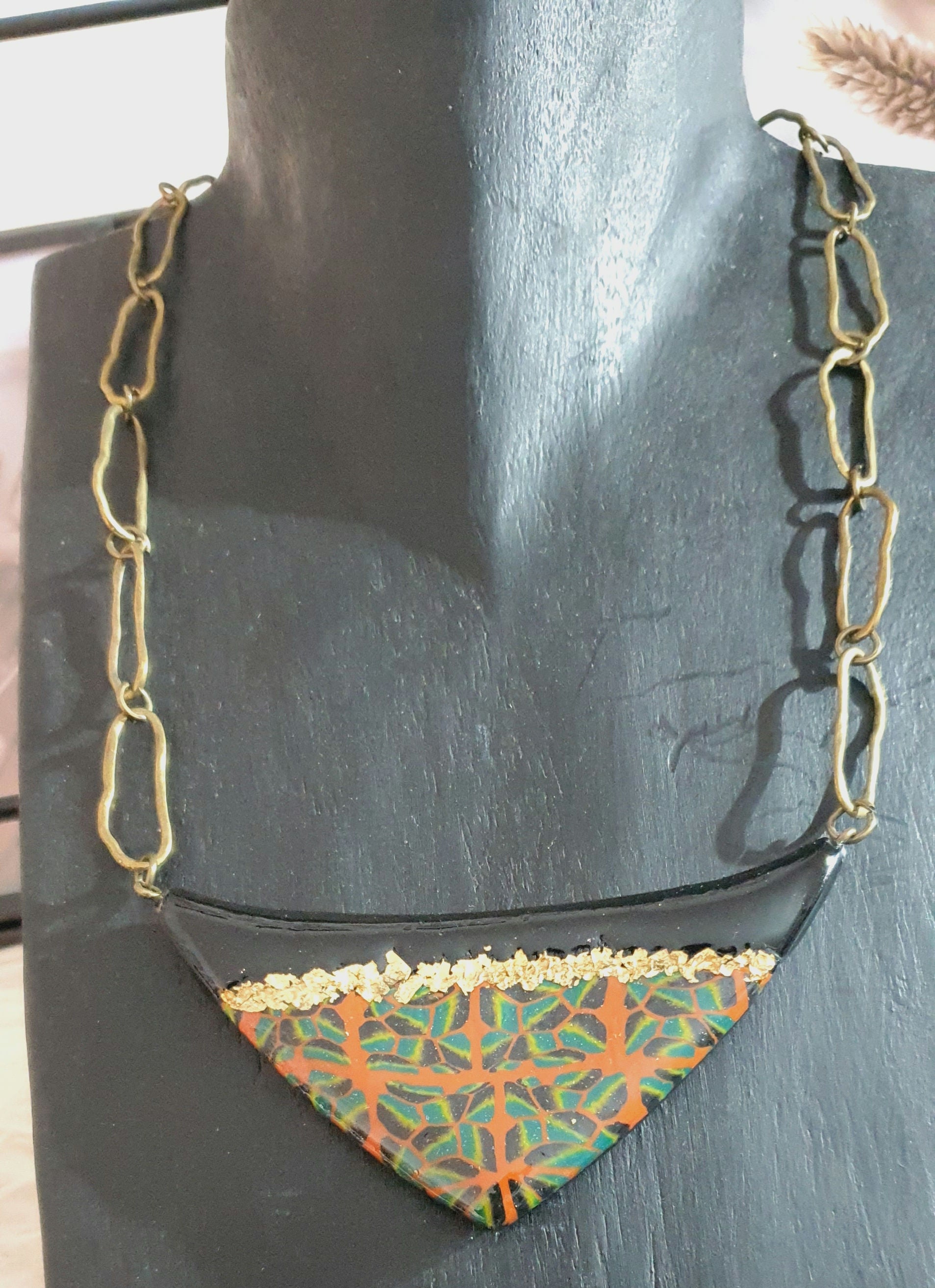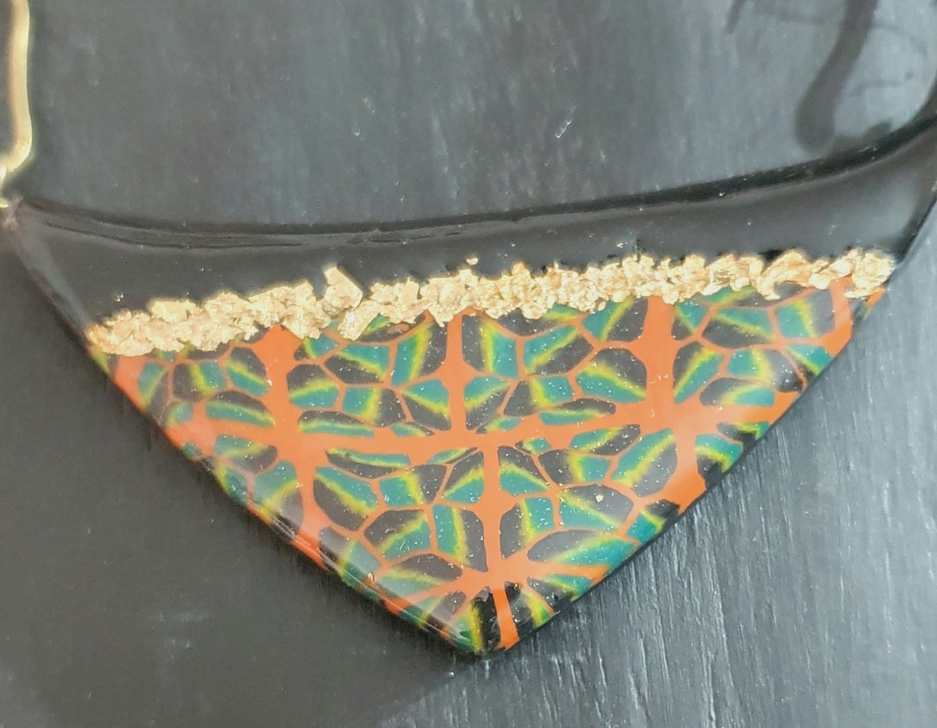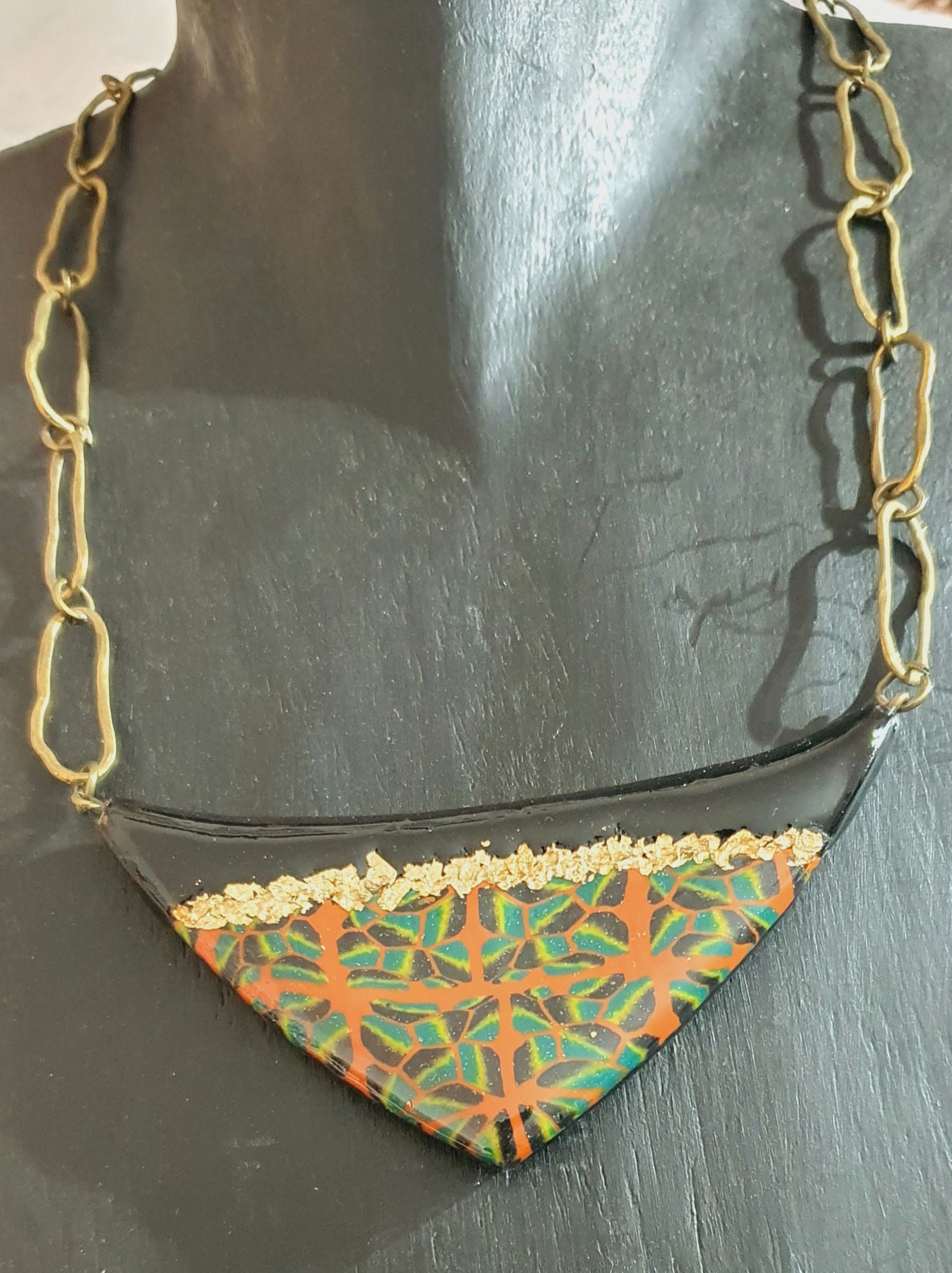 Obtenez un look élégant avec le collier "Terre Rouge" en pâte polymère. Avec sa forme triangulaire et son mélange de couleurs contrastées séparées par une ligne de feuille d'or, ce collier est un véritable bijou. La chaine en bronze de 48cm avec rallonge de 5cm offre une parfaite longueur pour s'adapter à votre tenue.