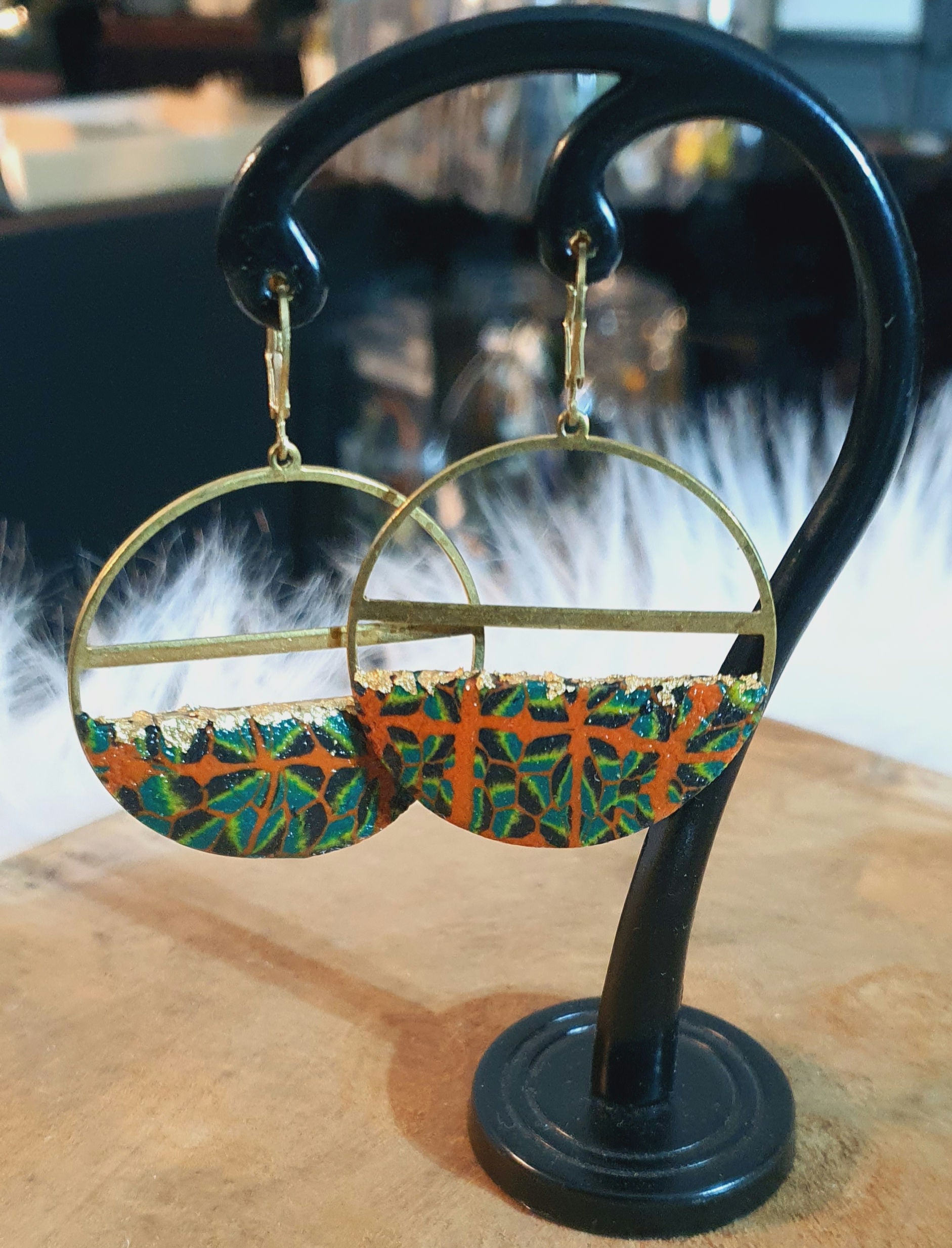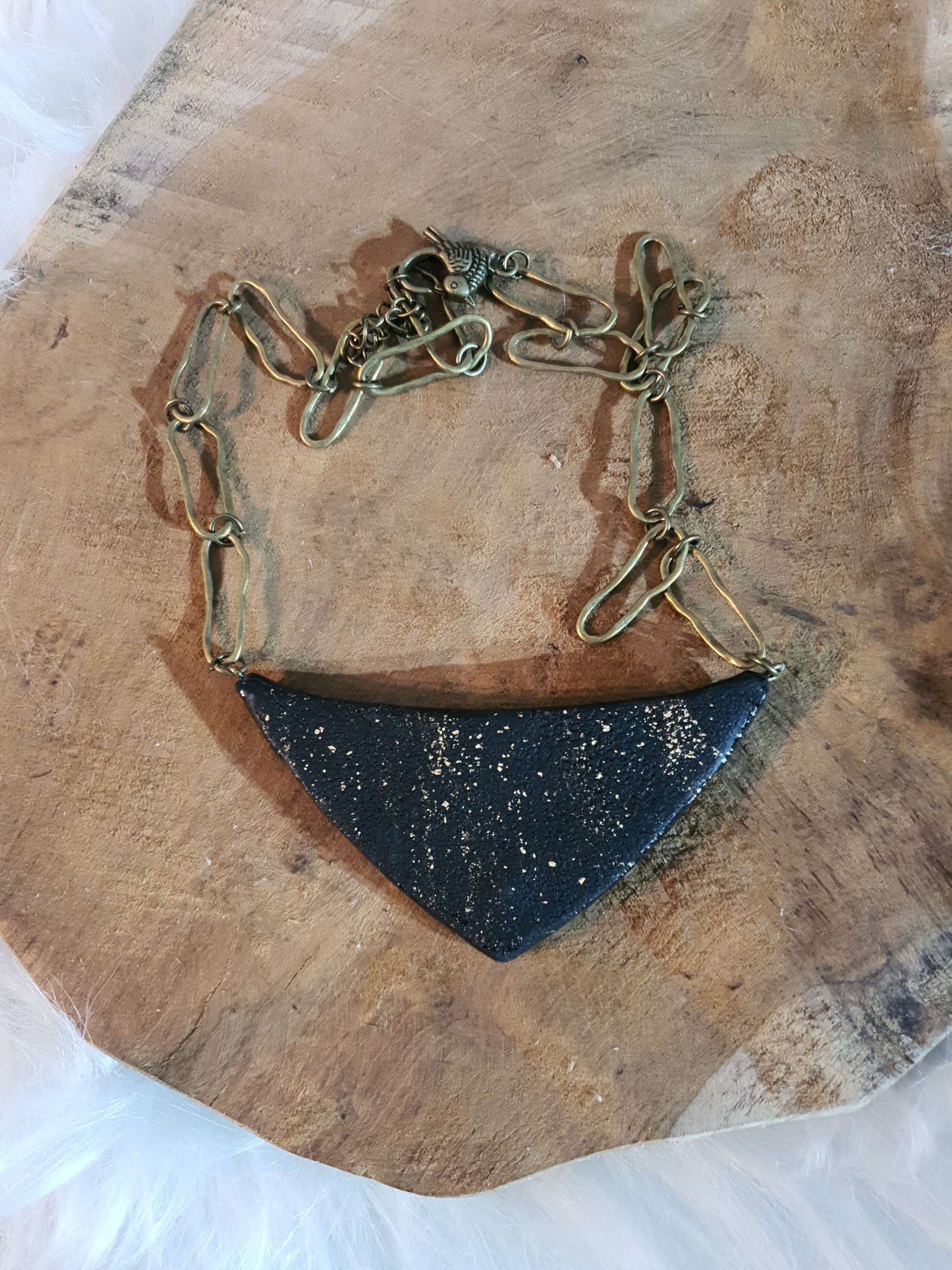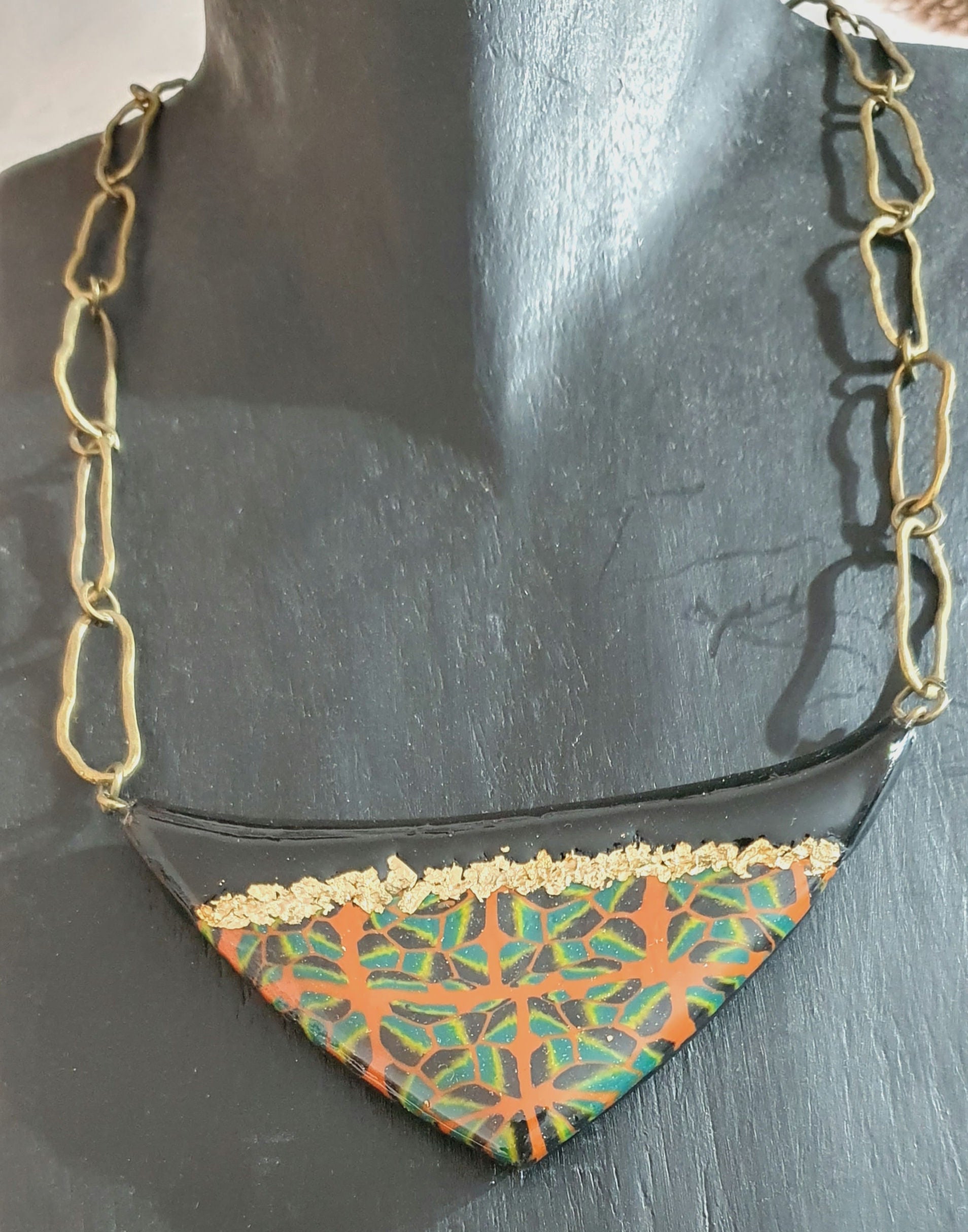 Obtenez un look élégant avec le collier "Terre Rouge" en pâte polymère. Avec sa forme triangulaire et son mélange de couleurs contrastées séparées par une ligne de feuille d'or, ce collier est un véritable bijou. La chaine en bronze de 48cm avec rallonge de 5cm offre une parfaite longueur pour s'adapter à votre tenue.