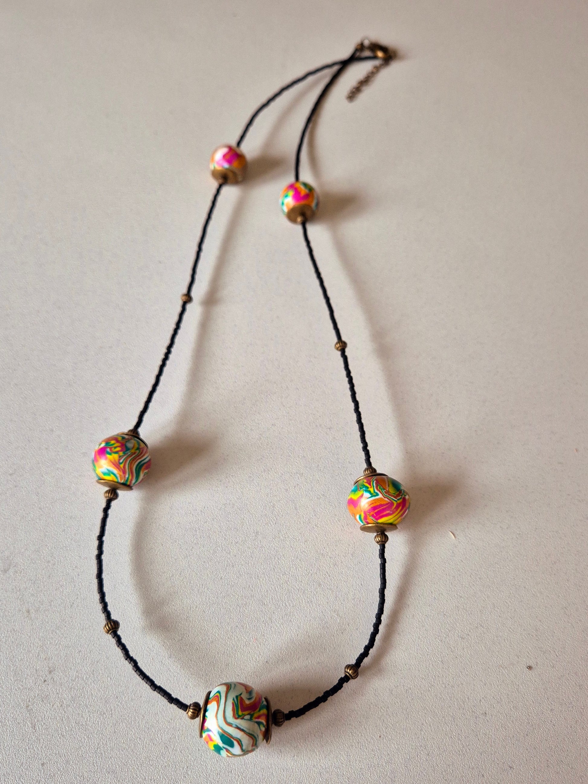 Le tout montées sur fil câblé avec des perles Miyuki noire. La longueur totale du collier est de 80 cm .